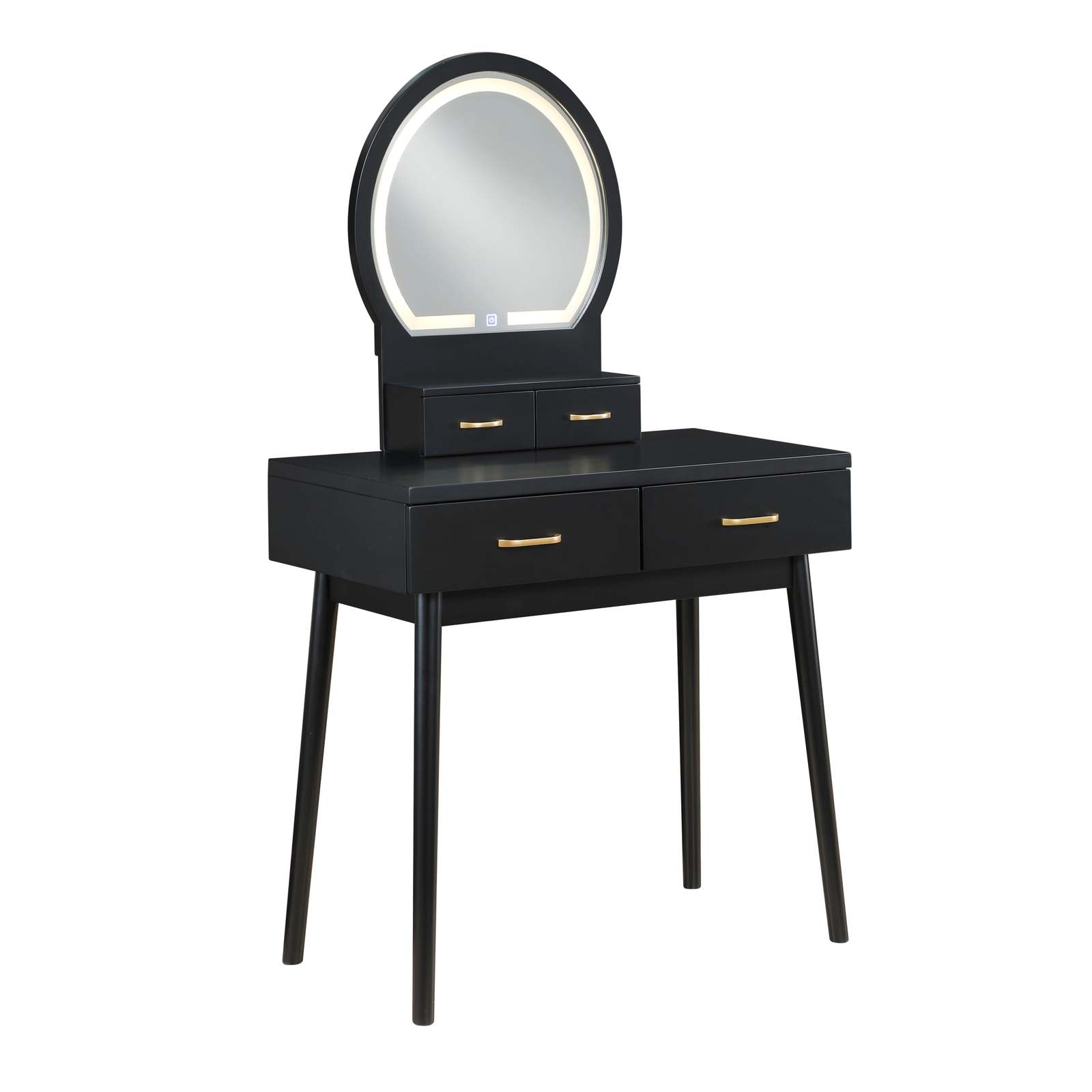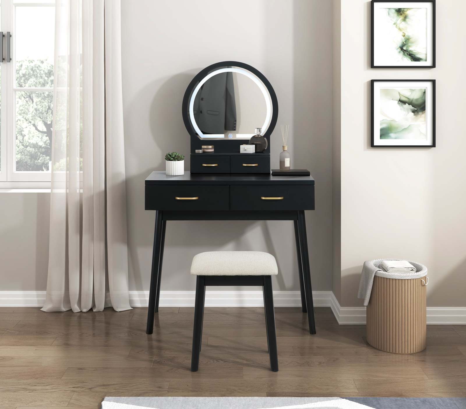 Transform your daily beauty routine into a luxurious experience with the modern vanity set. This elegant vanity, crafted from durable wood and engineered wood with a sleek black finish, provides the perfect space for your beauty regimen. The integrated LED-lighted mirror, activated by a smart touch sensor, offers optimal illumination, while four smooth-gliding drawers with polished brass-tone bar pulls provide ample storage for all your cosmetics and accessories. Complete with a matching padded stool, this set combines sophisticated design with practical functionality, making it an ideal addition to any bedroom or dressing area.