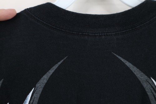 Dark spots/blemishes front, back. Collar, arms discolored. Graphics, color faded. Pilling