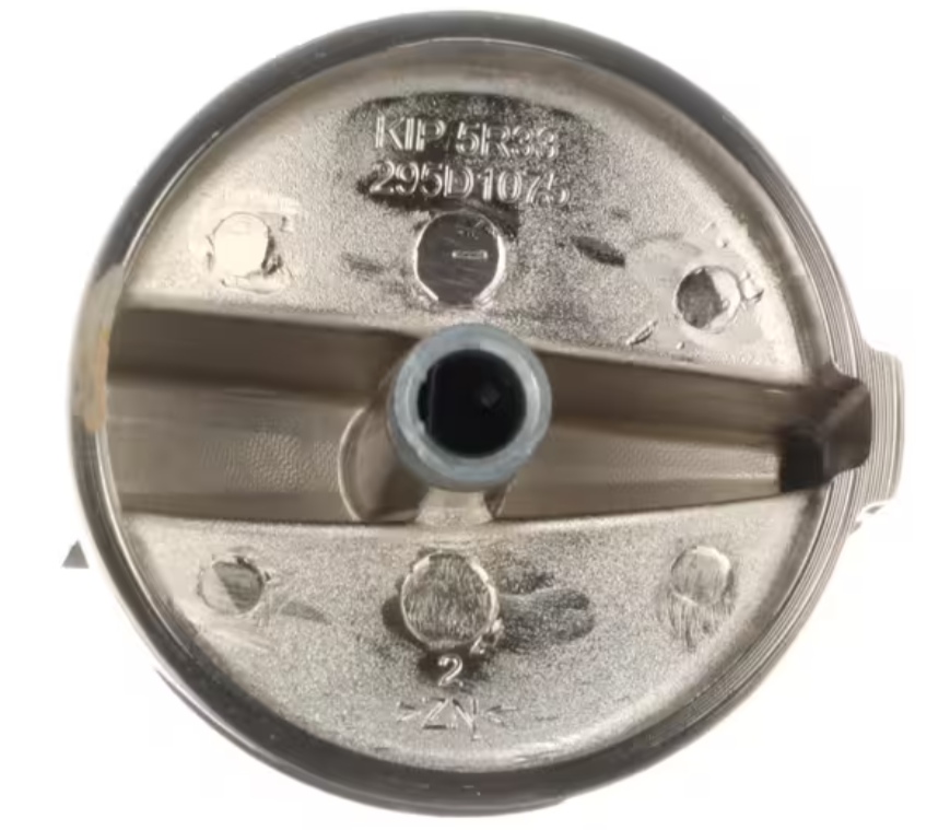 The GE Appliance Stainless Steel Top Burner Knob (part numbers KIP 5R33, 295D1075) is a genuine OEM replacement designed for select GE gas ranges. Built from durable stainless material, this knob offers smooth operation and a polished finish that enhances the look of your appliance while ensuring reliable burner control.