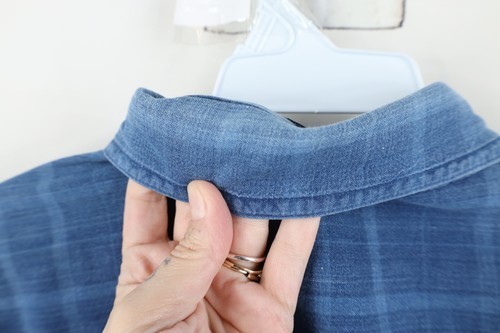 Sun faded/blemished/discoloring collar, right arm. Loose threads right cuff. Collar, arms/cuffs, front discolored. Color faded. Pilling