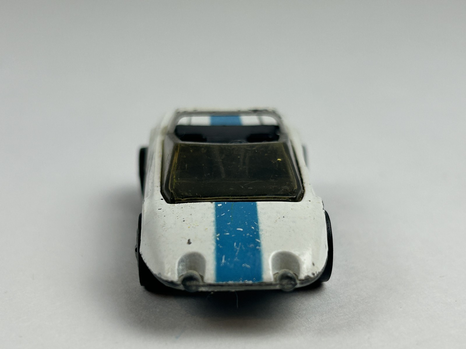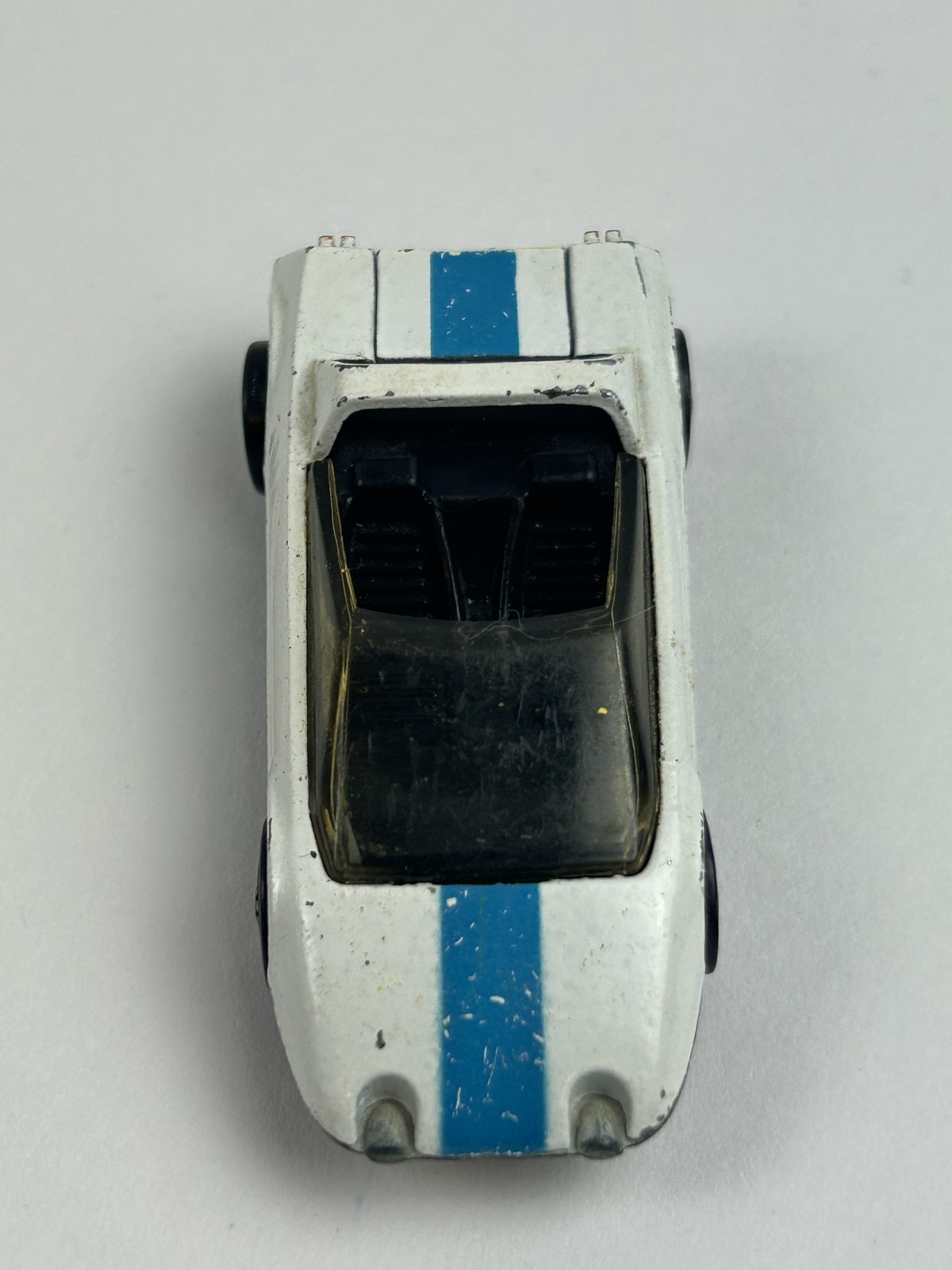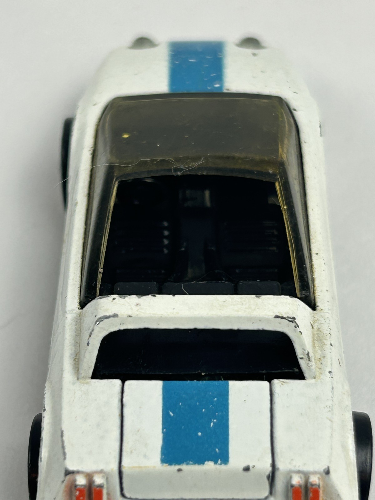 Features original white enamel paint with blue racing stripe on hood and rear deck