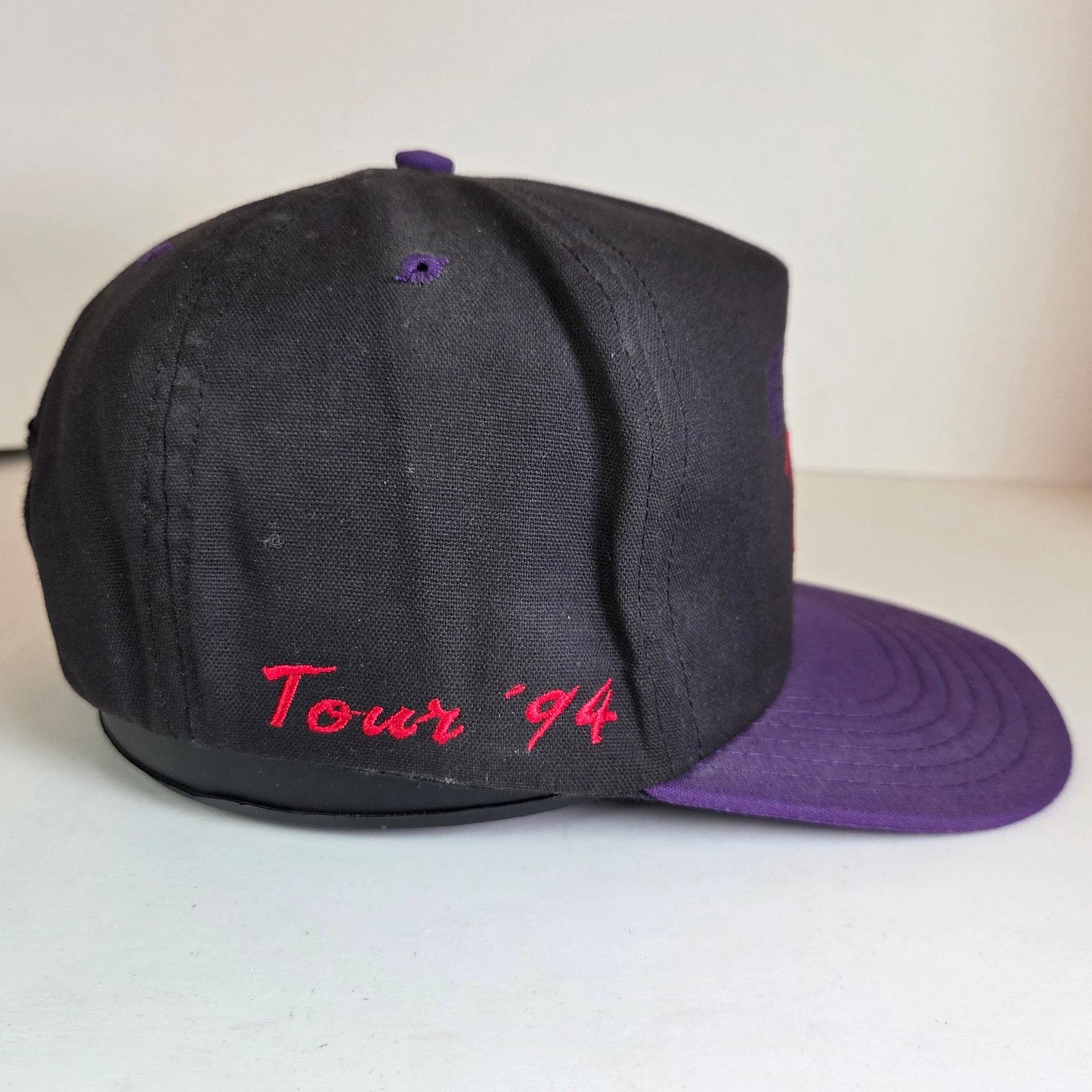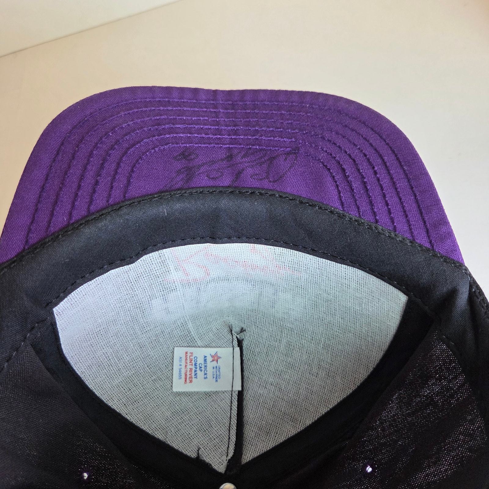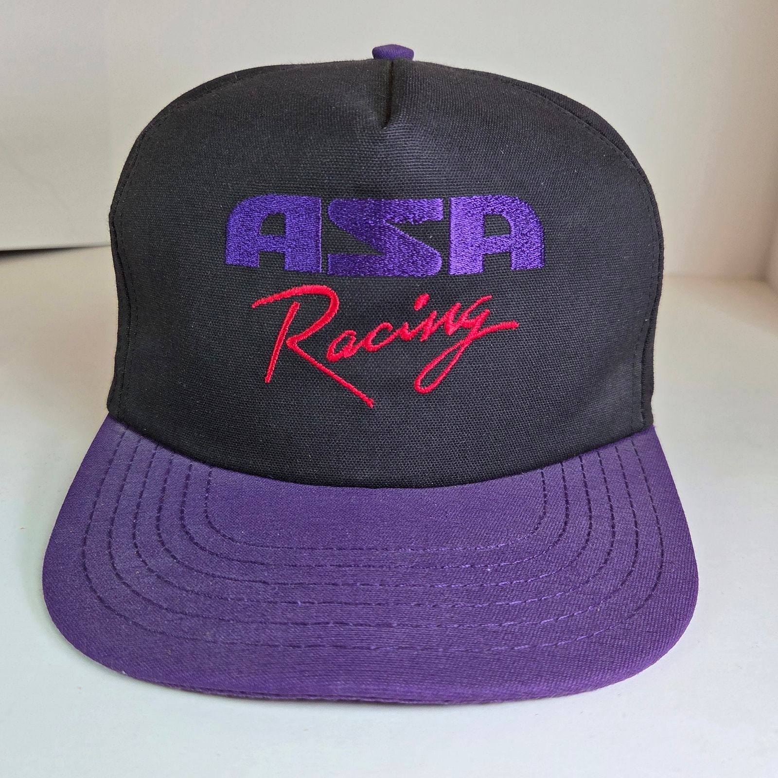 Step back into motorsports history with this vintage ASA Racing Tour ?94 snapback hat, made in the USA by Flint River Manufacturing (America?s Cap Company). The black foam-front crown is accented with bold purple ASA embroidery and red ?Racing? lettering, with ?Tour ?94? stitched on the side. The brim is deep purple, and the adjustable snapback closure features the original Made in USA stamp.