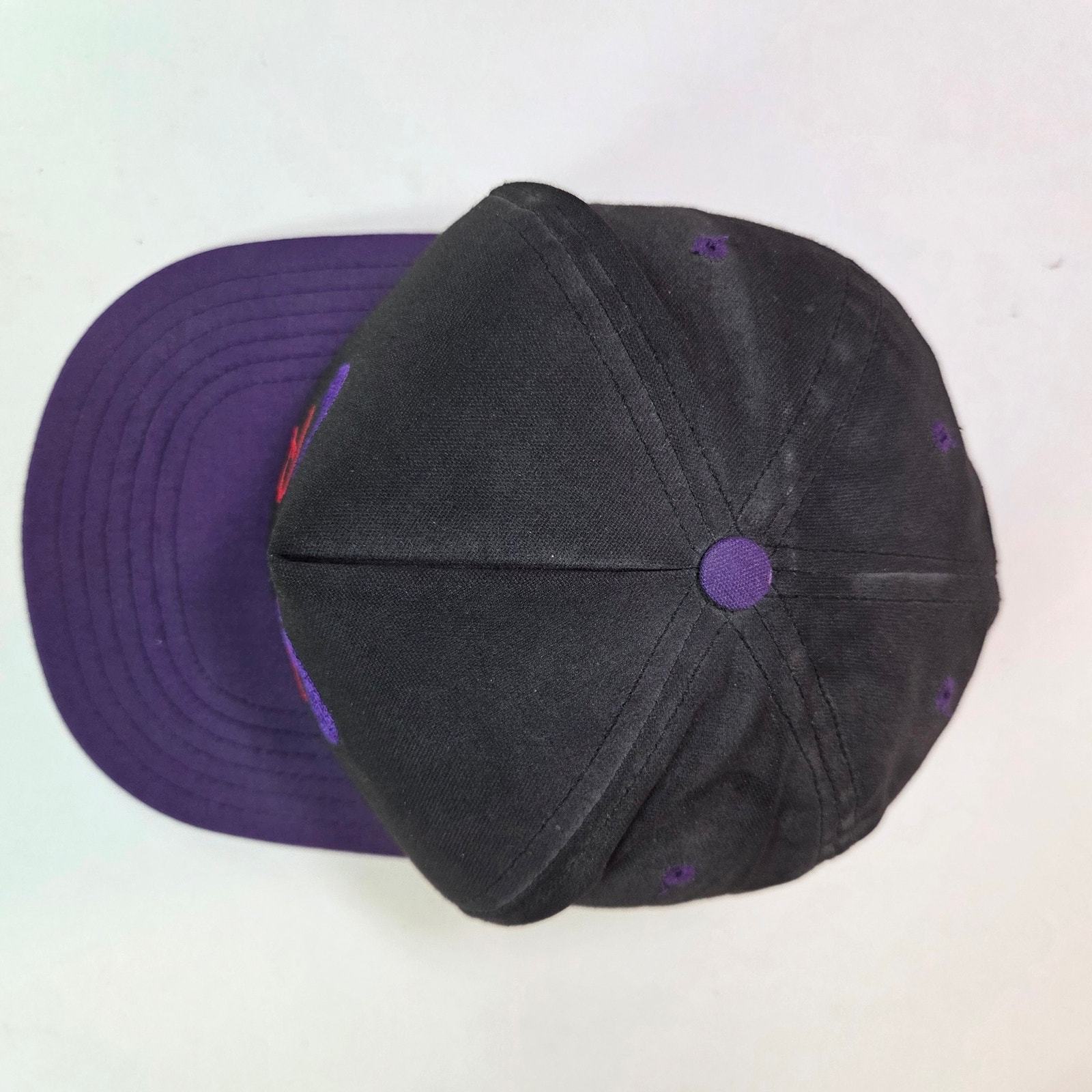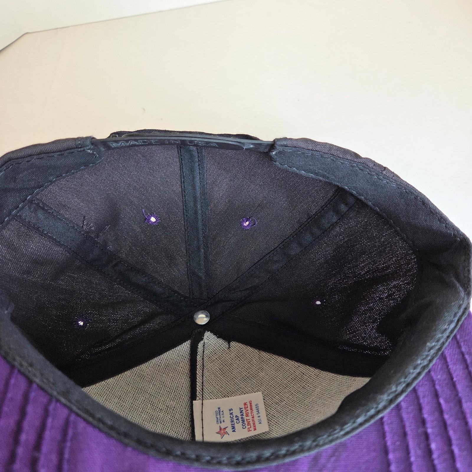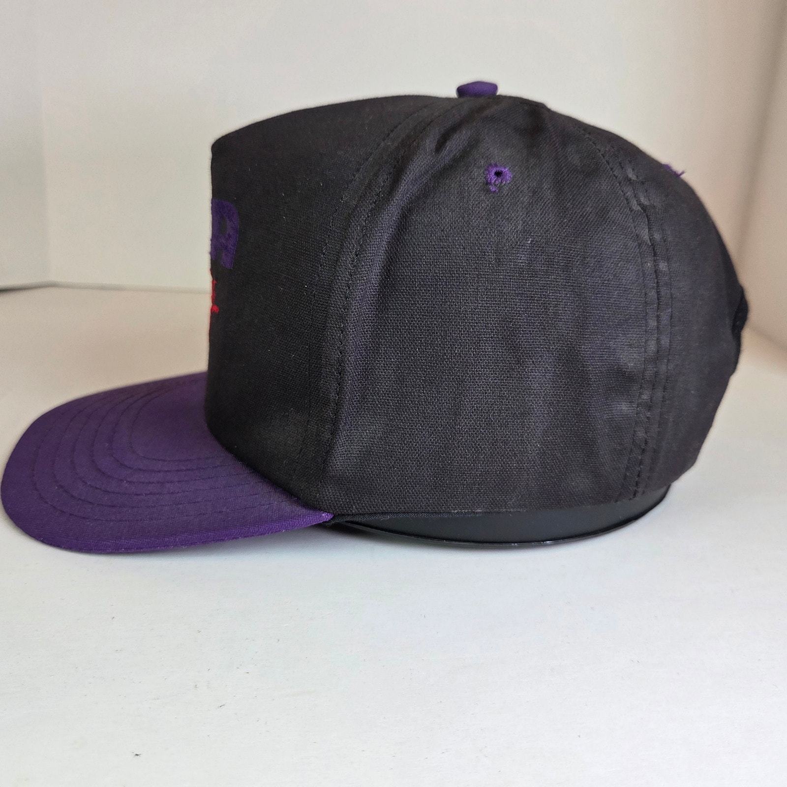 Step back into motorsports history with this vintage ASA Racing Tour ?94 snapback hat, made in the USA by Flint River Manufacturing (America?s Cap Company). The black foam-front crown is accented with bold purple ASA embroidery and red ?Racing? lettering, with ?Tour ?94? stitched on the side. The brim is deep purple, and the adjustable snapback closure features the original Made in USA stamp.