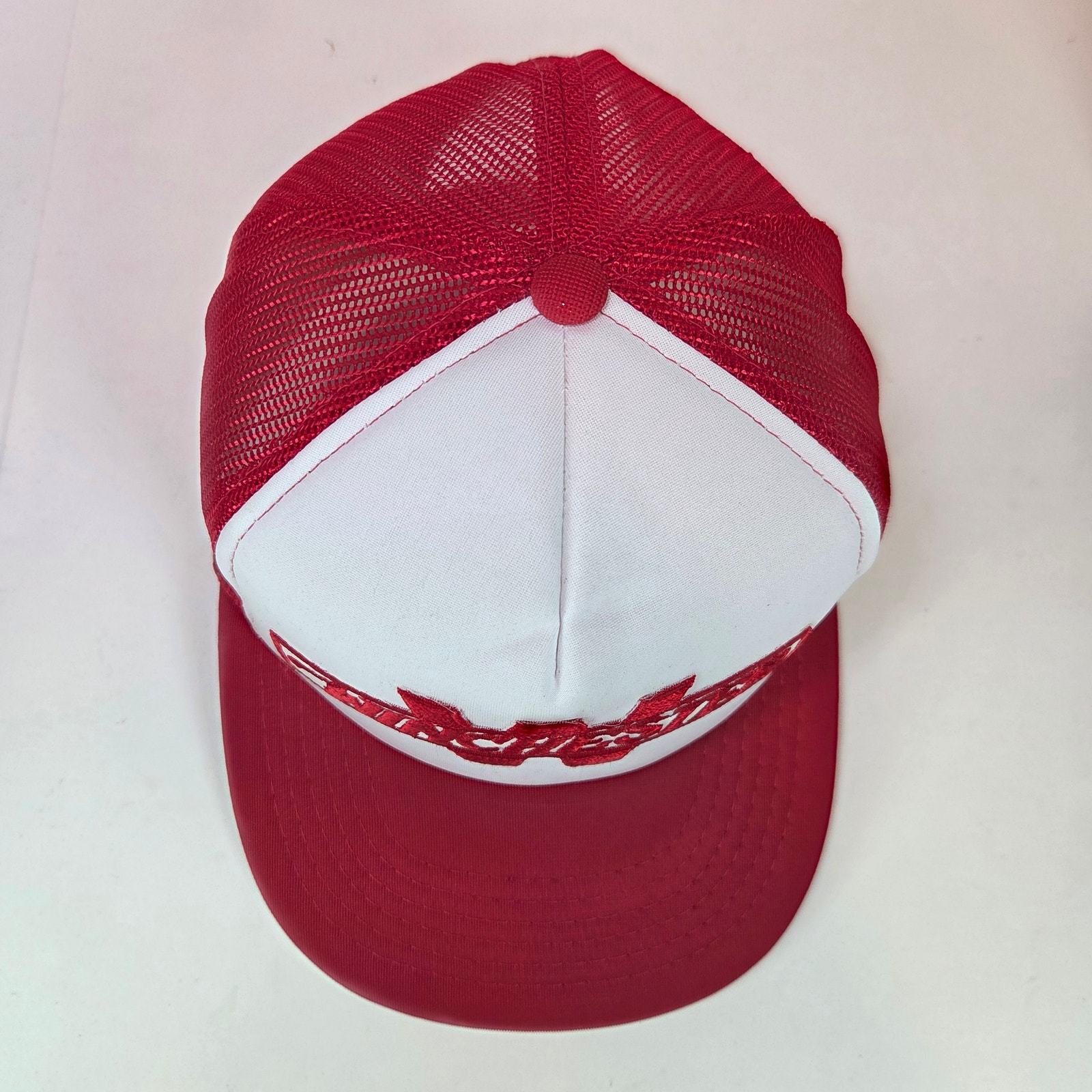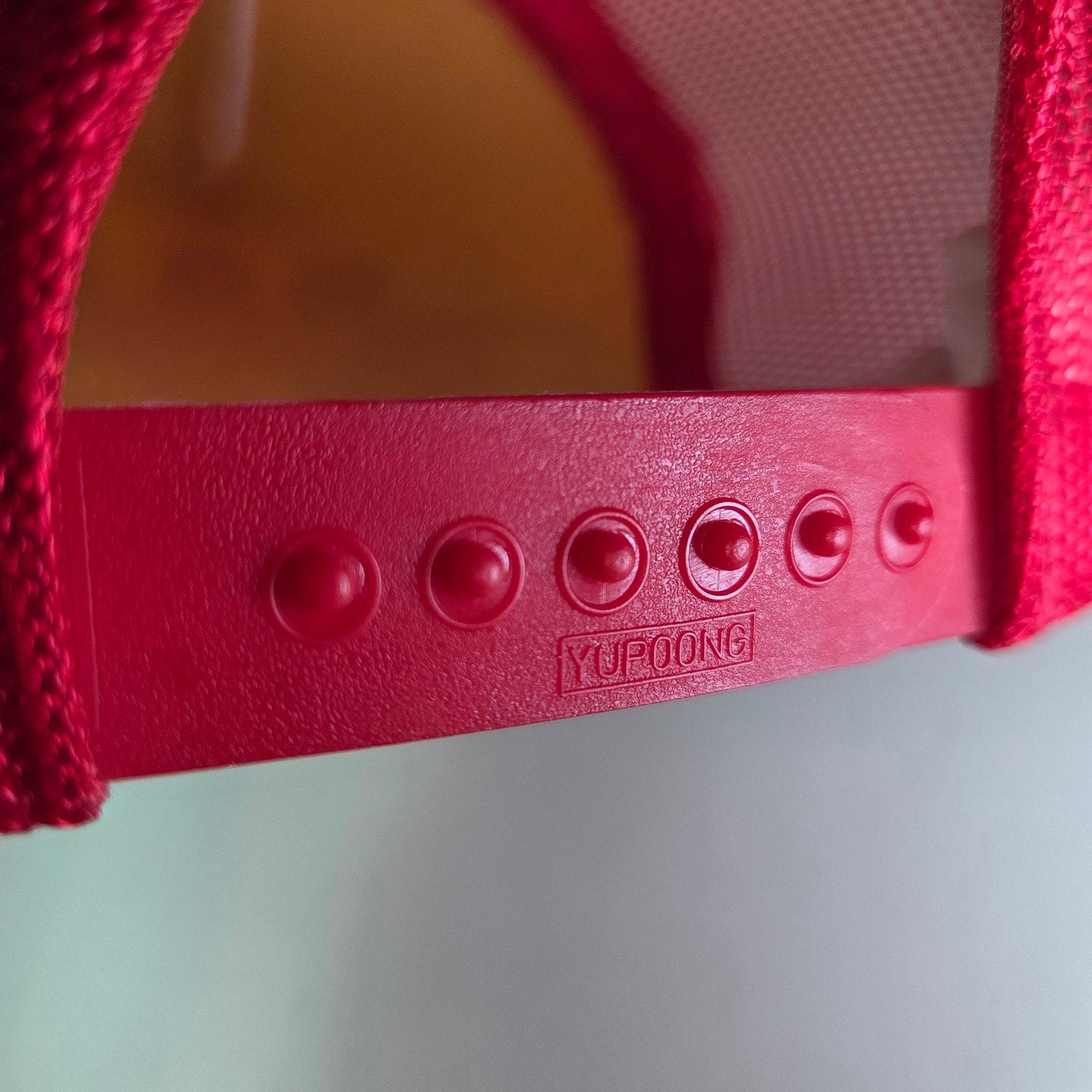 This is a vintage Winchester embroidered logo trucker hat with bold red and white styling. Features a structured foam front panel, mesh back for breathability, and an adjustable Yupoong snapback closure. A collectible piece of hunting and outdoor lifestyle branding from the late 80s?90s.