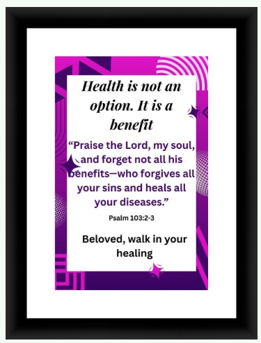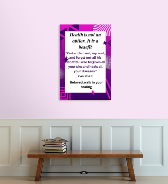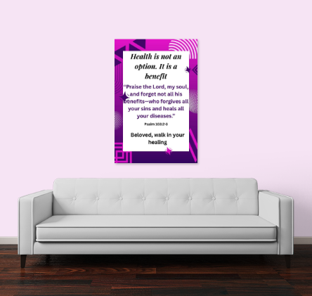 The central declaration—“Health is not an option. It is a benefit”—reminds believers that healing is part of the covenant, not a distant hope. Whether placed in a hallway, prayer room, or living space, this piece serves as a daily invitation to walk in divine health and grace.