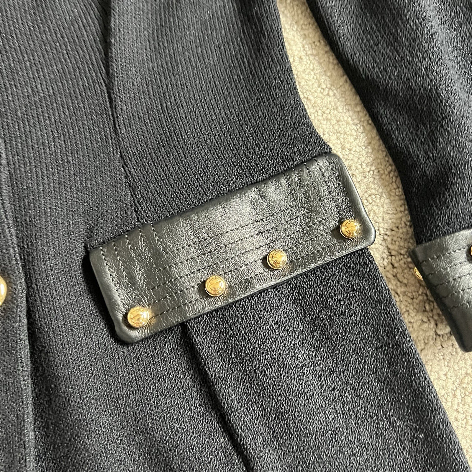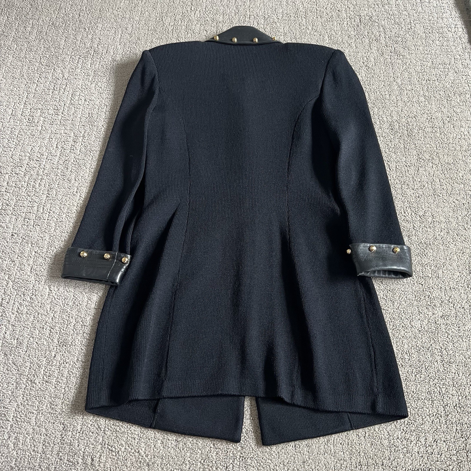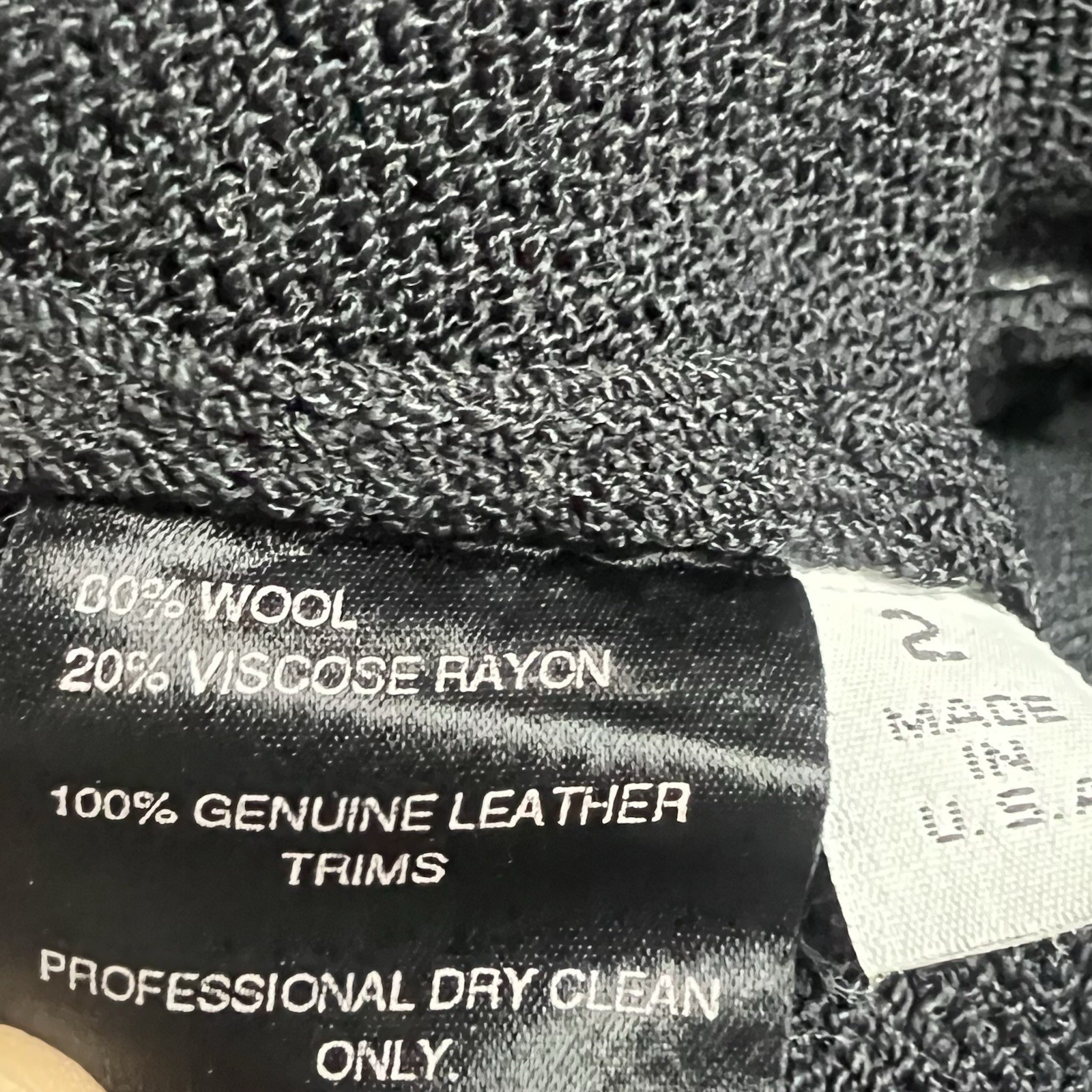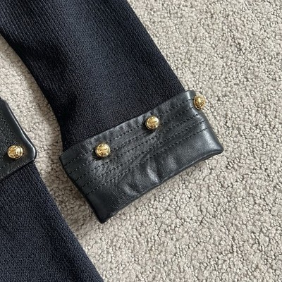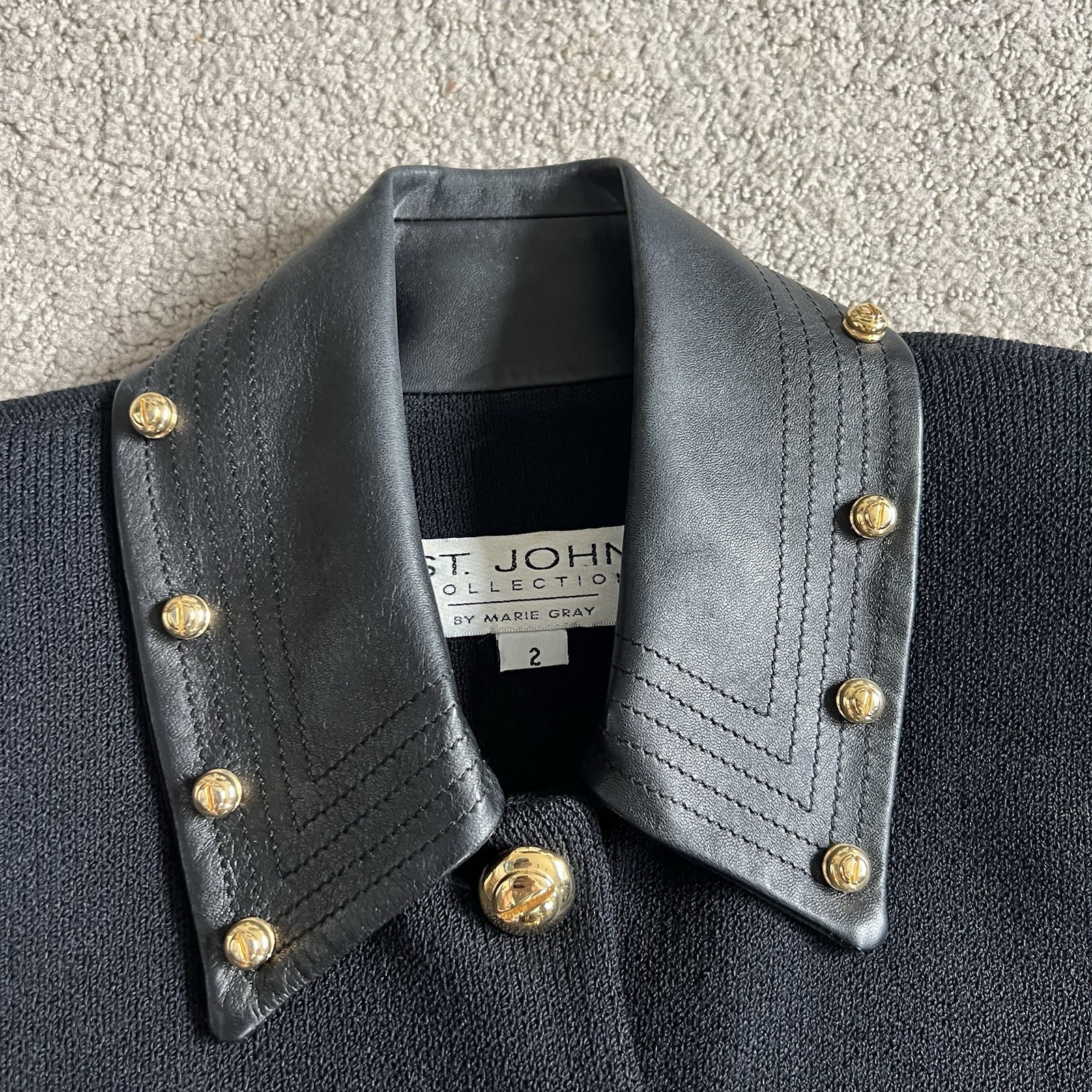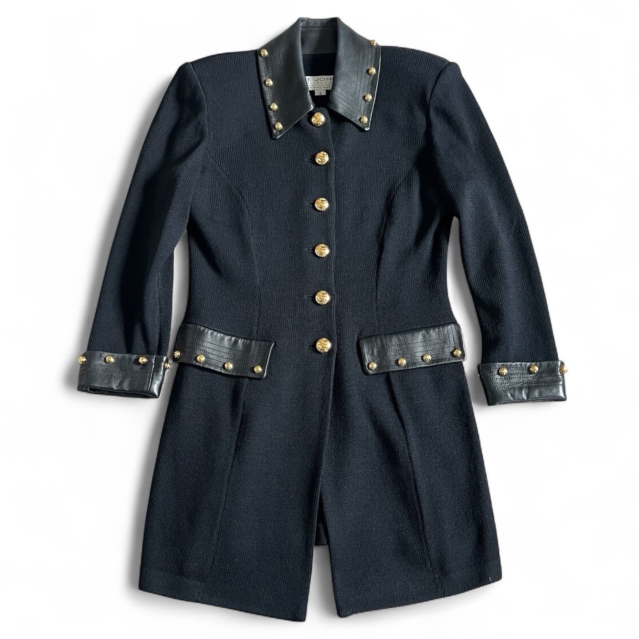 VTG St. John Womens Jacket Sz 2 Black Santana Knit Leather Trim Gold Buttons EUC