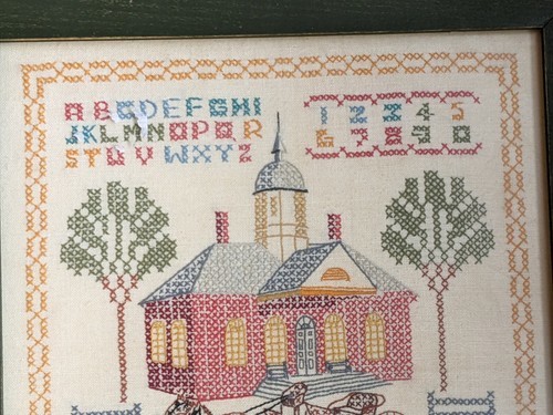1971 Colonial Williamsburg VA Escarpin Maison Sampler Point de Croix Encadré