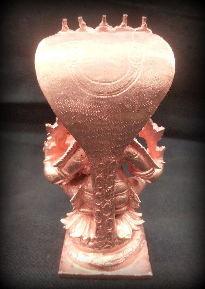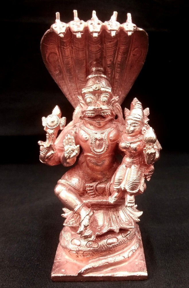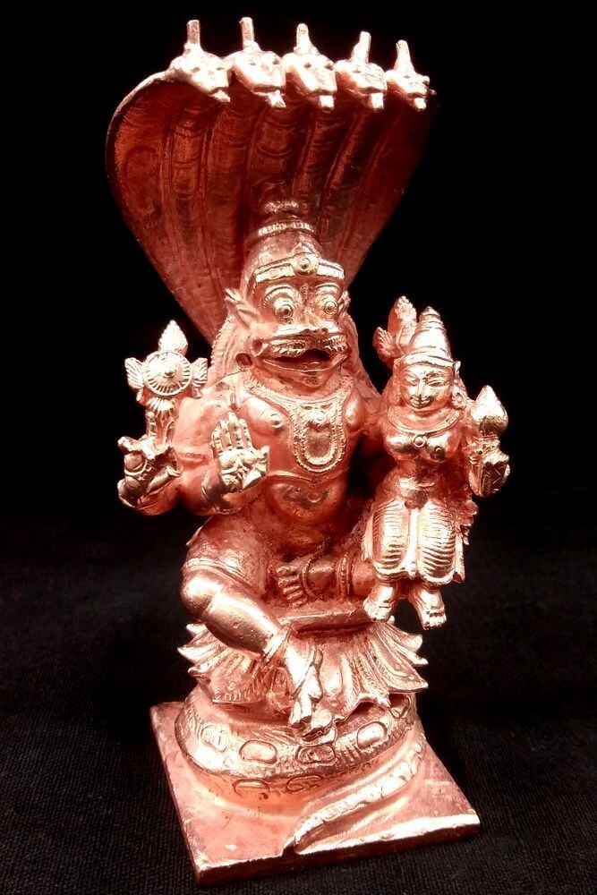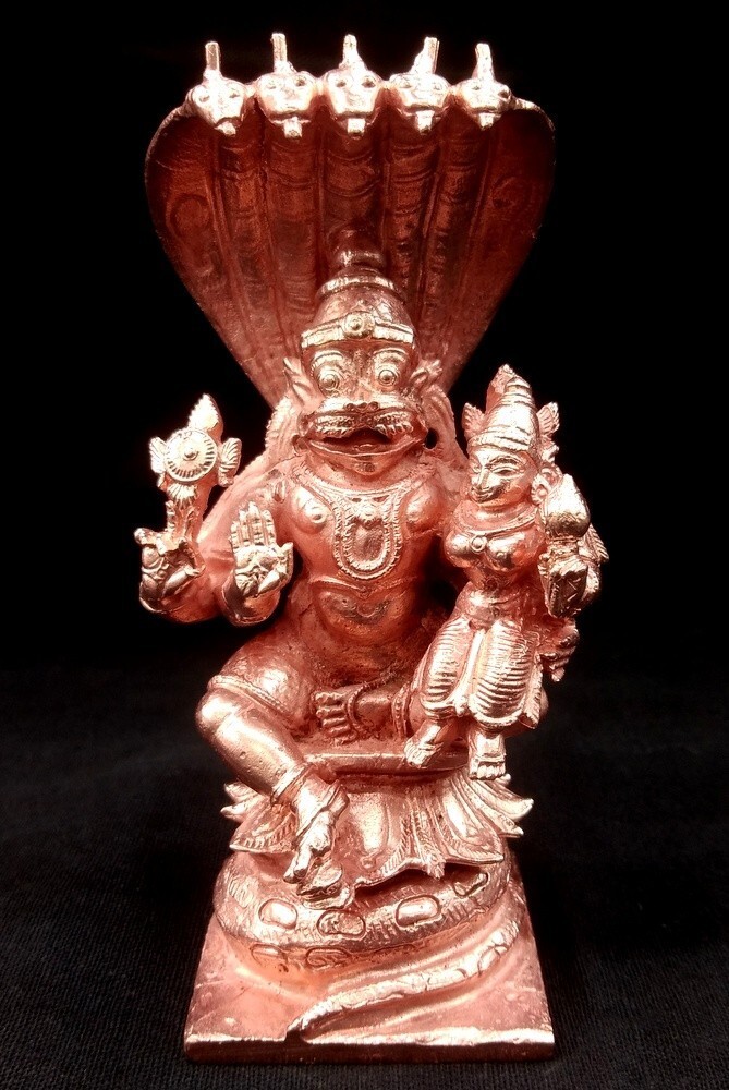 Design : Beautiful Lord Narsimha in his Malola (Calm) with Goddess Laxmi seated on her lap made in pure copper , narsimha with four hands holding Shankha , Chakra , Padma (Lotus) and one right hand on blessing pose with Five Headed Snake on the Top side .
