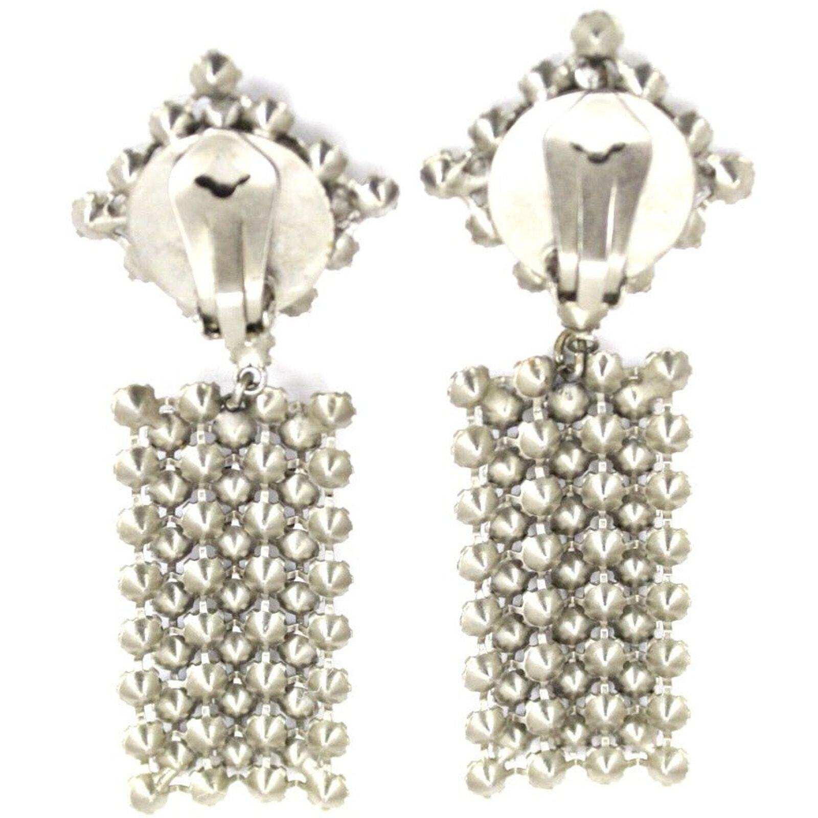 vtg Earrings Statement Blue Clear Stepped Rhinestones Clip Back White Metal 3.5"