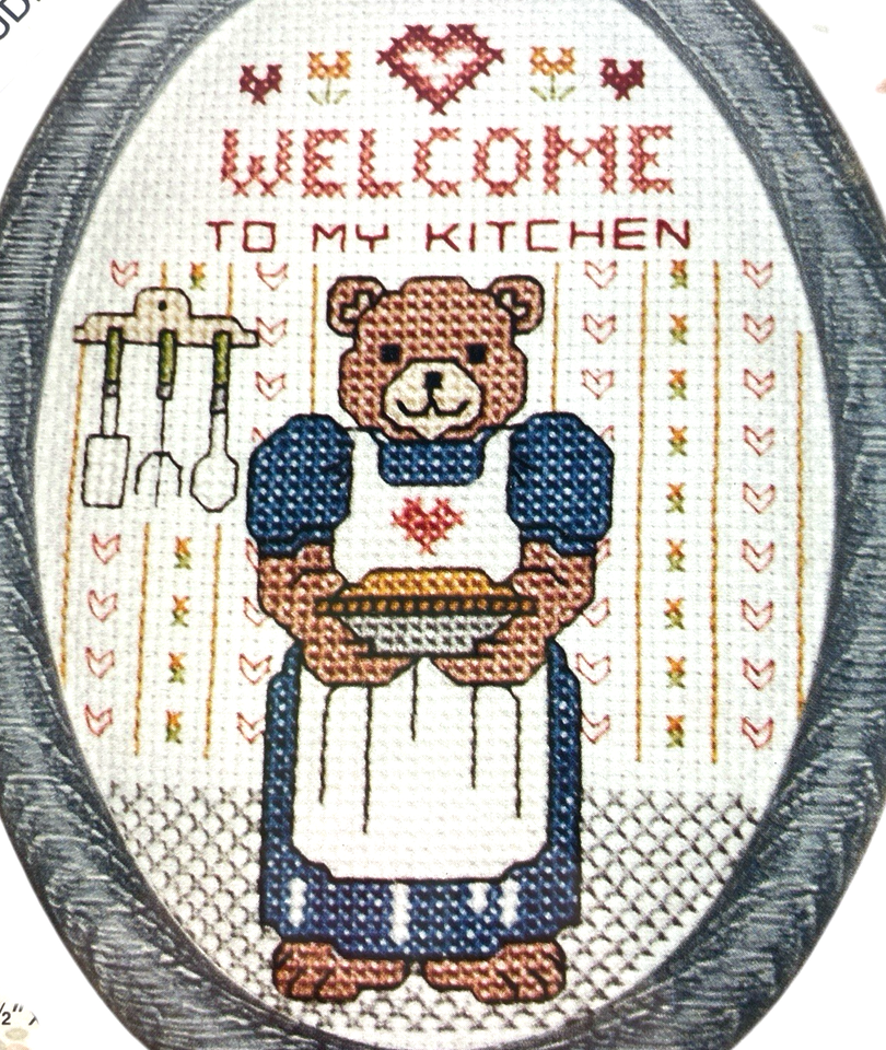 New Berlin Co. Cross Stitch Kit Welcome to my kitchen Bear Holding Pie w Frame