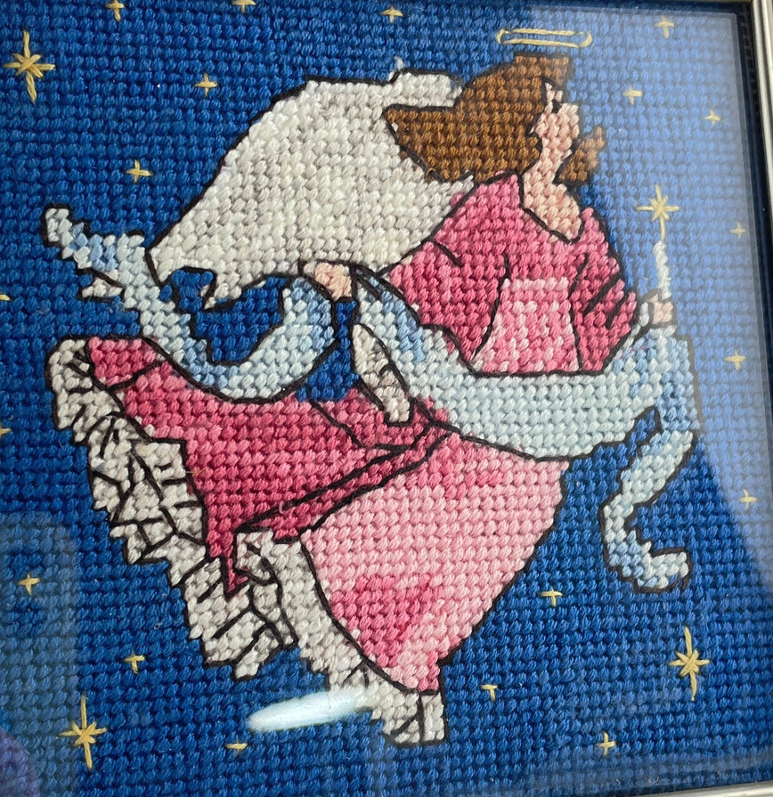 Finished Cross Stitch Angel in Pink Dress with Blue Banner and Candle Stars