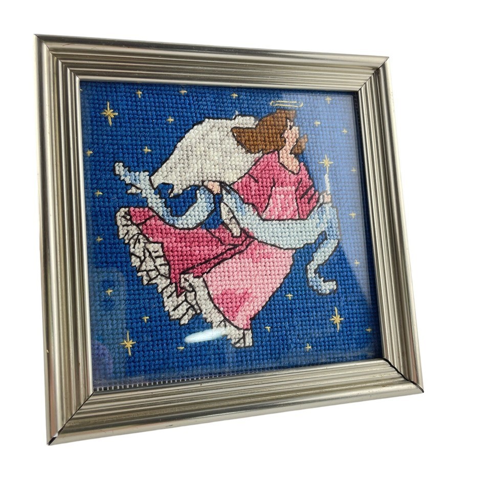 Finished Cross Stitch Needlepoint Pink Angel in Frame