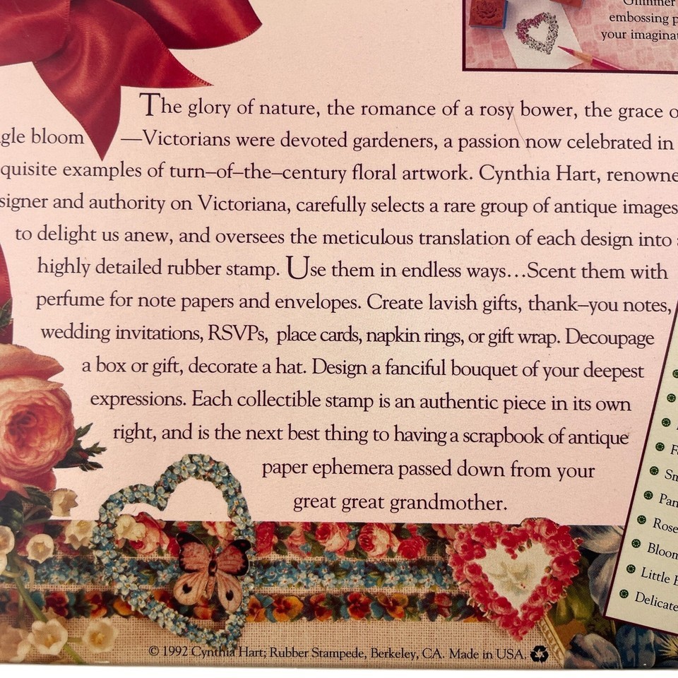 This is a set of 19 mounted rubber stamps designed by Cynthia Hart with a Victorian theme. The stamps feature romantic floral, heart, and butterfly designs, perfect for crafting projects. The set is made in the United States and is ideal for adding a touch of vintage elegance to your creations.