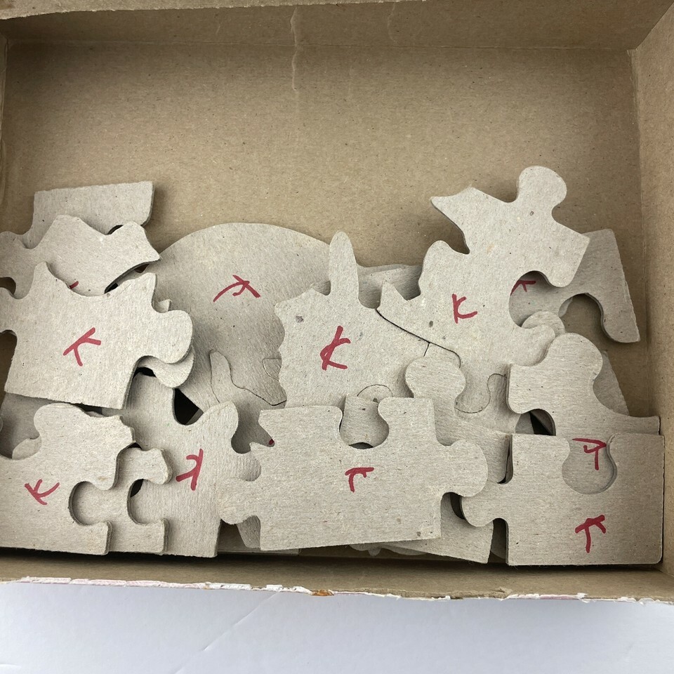 Condition: Puzzle is complete and in good pre-owned condition with one piece taped up which makes the pieces not fit as closely as they should. The letter K is marked on the back of the pieces. Box has wear and tape. See photos.