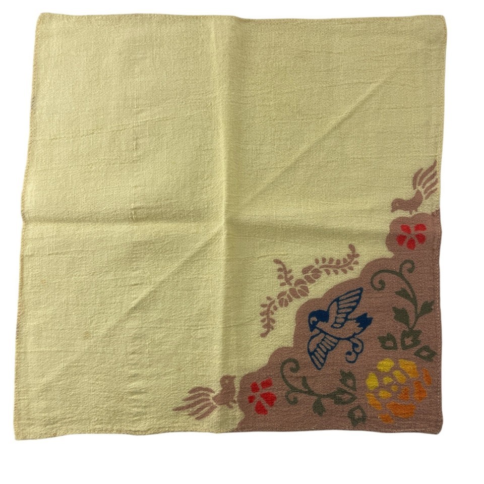 Six Vintage Dinner Napkins Beige w Bird Folk Art Design 11" x 11"