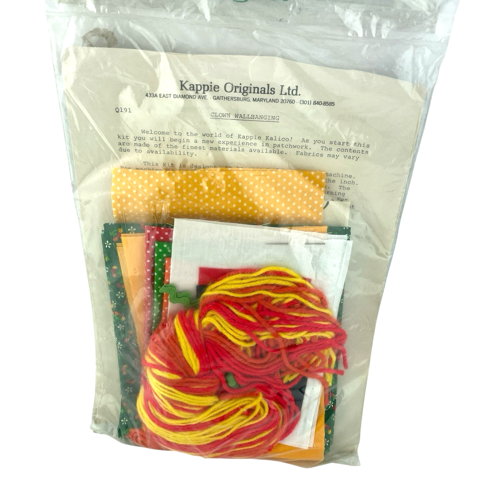 The Kappie Originals Kalico Patchwork Clown Balloon Wall Hanging Kit Q191 by Bickel is designed to be stitched by hand or machine. The kit featuring a unique clown theme with a patchwork design. Made in the United States, this wall hanging kit includes all the necessary materials to create a festive and colorful addition to any room. Perfect for crafters looking to add a whimsical touch to their home decor, this kit by Kappie Originals offers a fun and creative project for anyone who enjoys embroidery and cross-stitch.