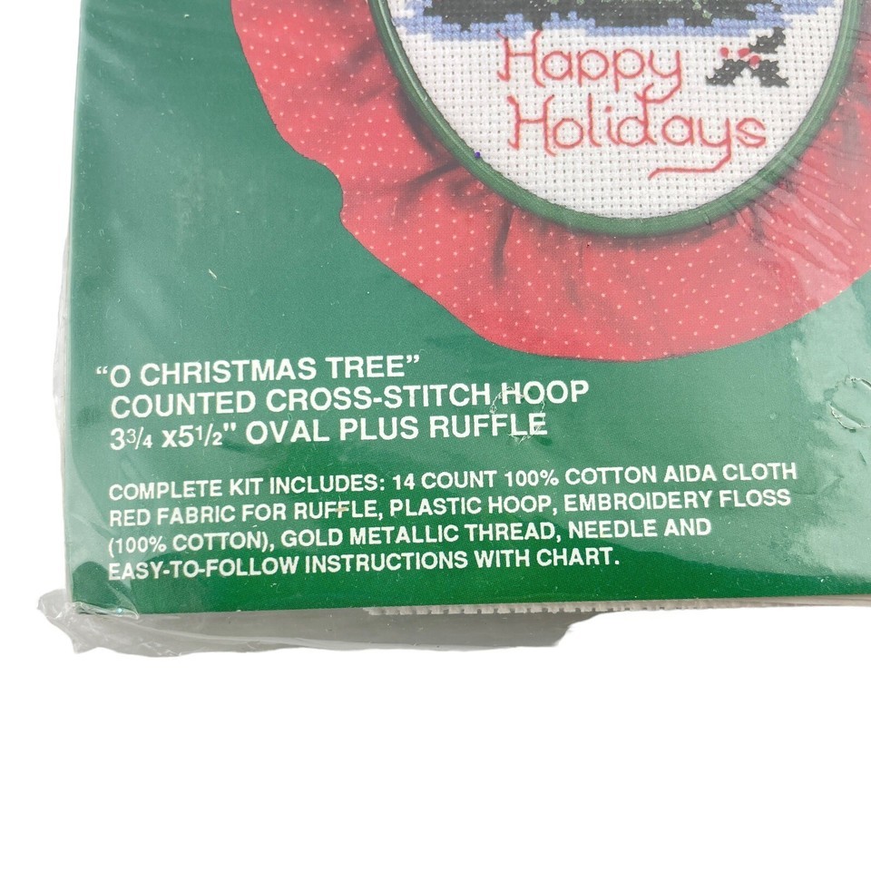 Kit 32975 "O Christmas Tree" features a candlelit Christmas tree. Includes frame and material for ruffle. 3.75" x 5.5" oval. Designer Bonnie Disotell.