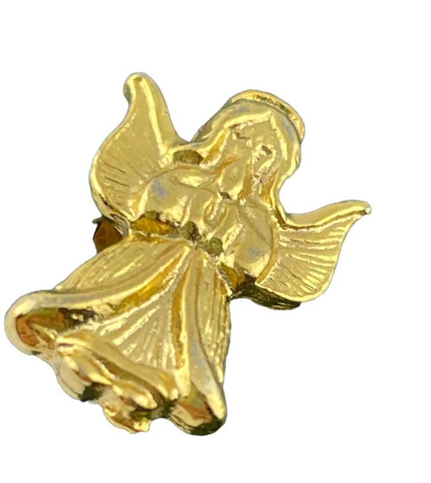 Gold colored embossed flat cat ornament and angel pin. Light wear.