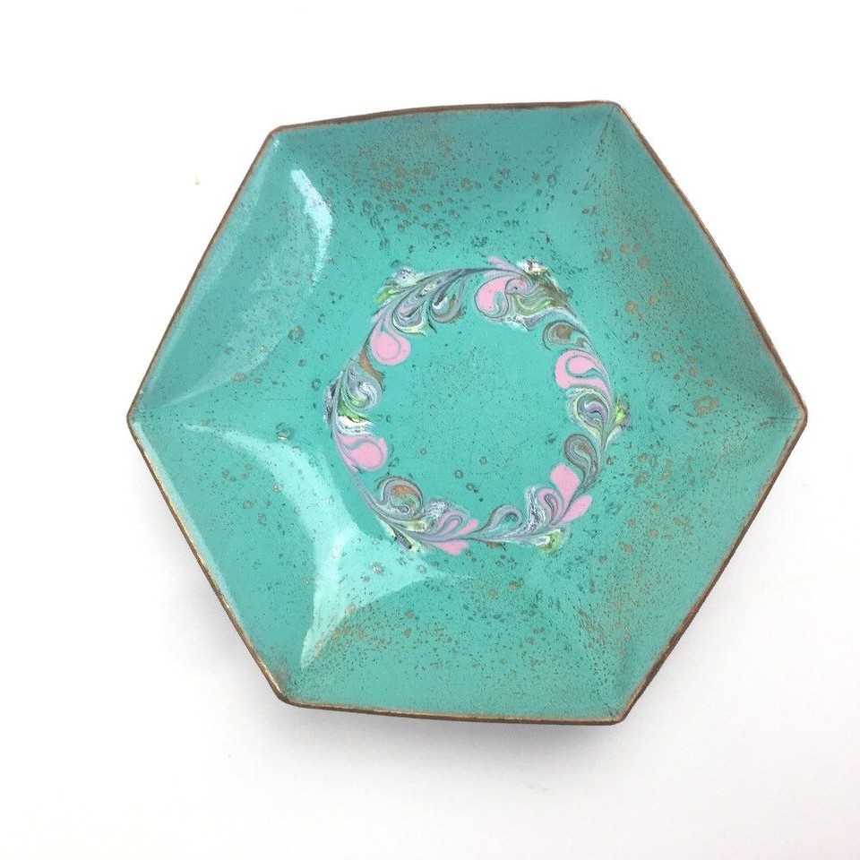 Beautiful bluish green with gold, copper, pink and lavender paisley floral. Interesting connect the dots center design - could be a bird, butterfly, fish or abstract, depending upon the viewing angle. Unique six sided hexagon shape. Copper bottom with original tag.