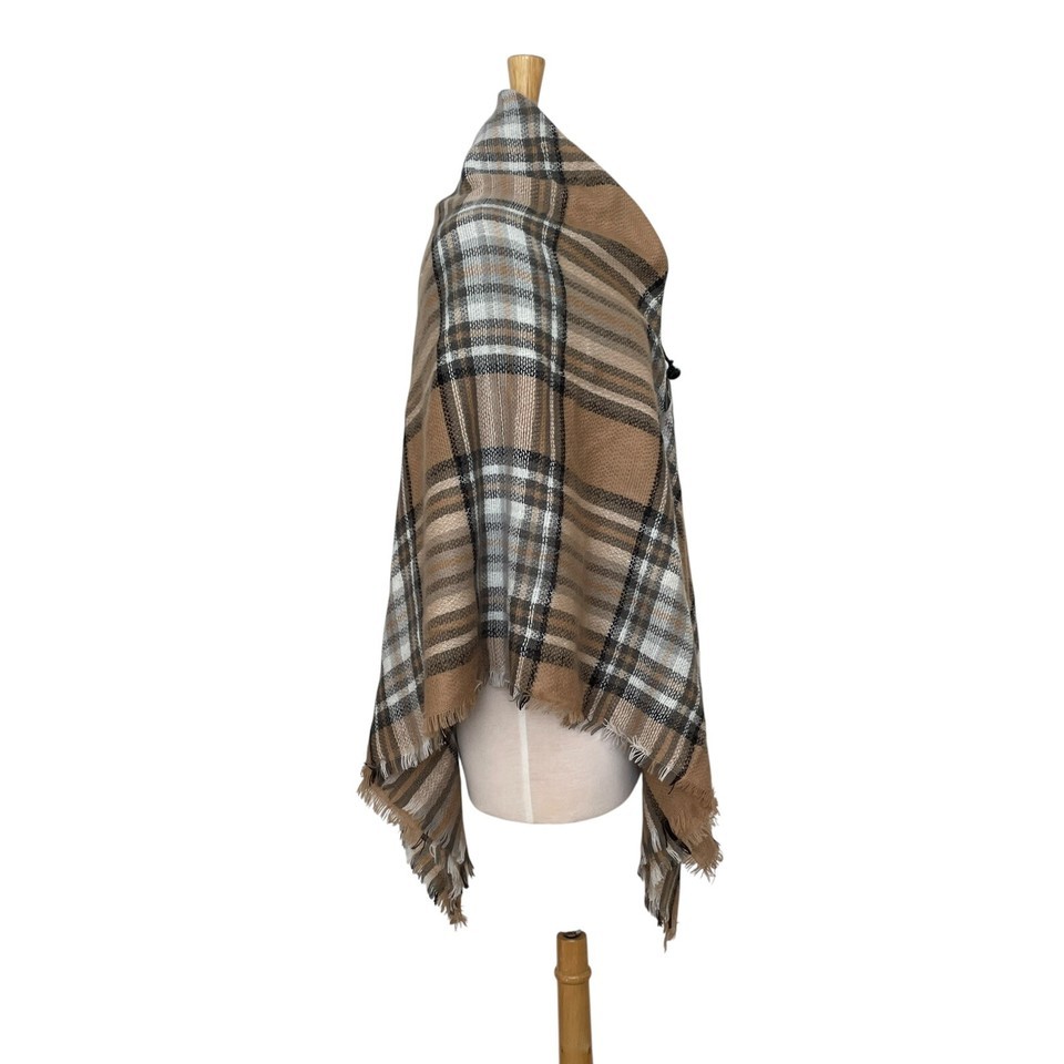 Beige black and white classic plaid with black toggel closure. Fringed edge.
