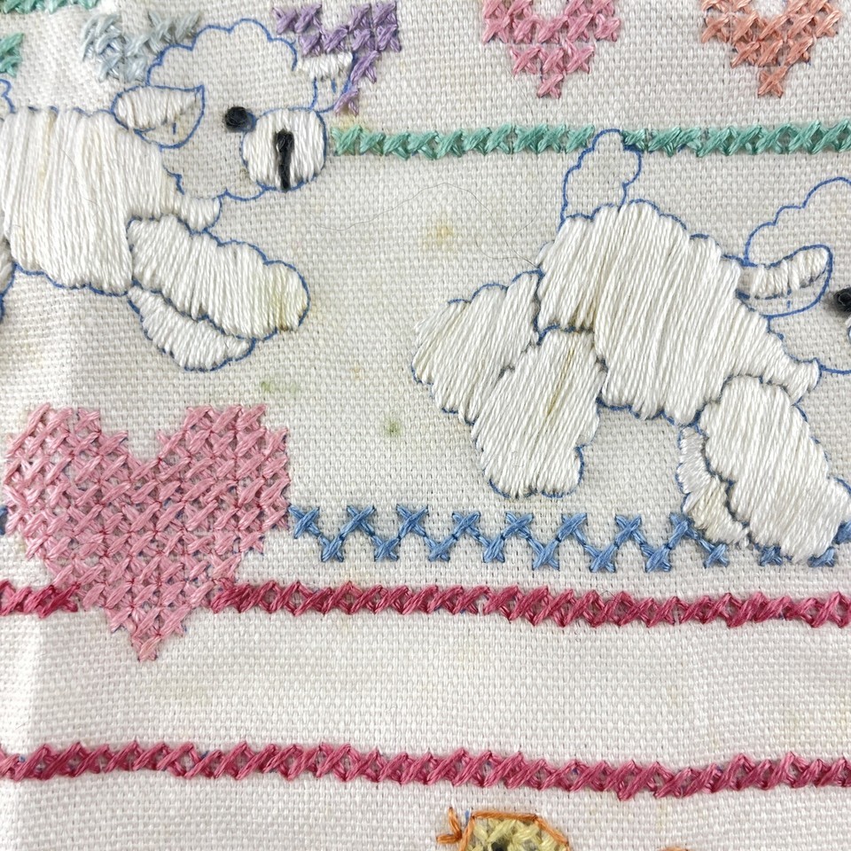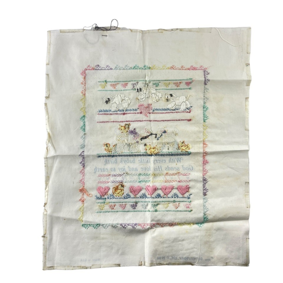 Condition: Partially finished cross stitch - the lambs noses in the middle section need some black and white thread to finish their snouts. Some small discolorations here and there. See photos.