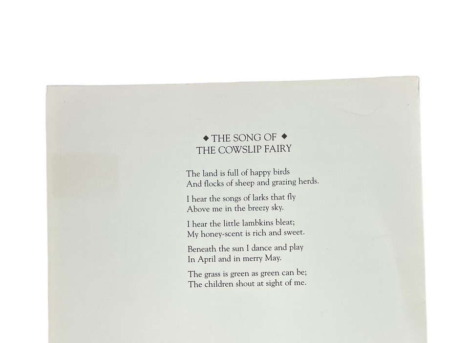Features a sweet fairy girl in a yellow dress with green wings carrying a stalk of Cowslips as she walks across a green meadow.