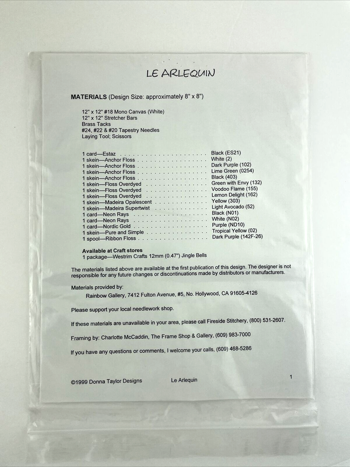 Donna Taylor Needlepoint PATTERN Mask Le Arlequin The Harlequin 5th in a Series