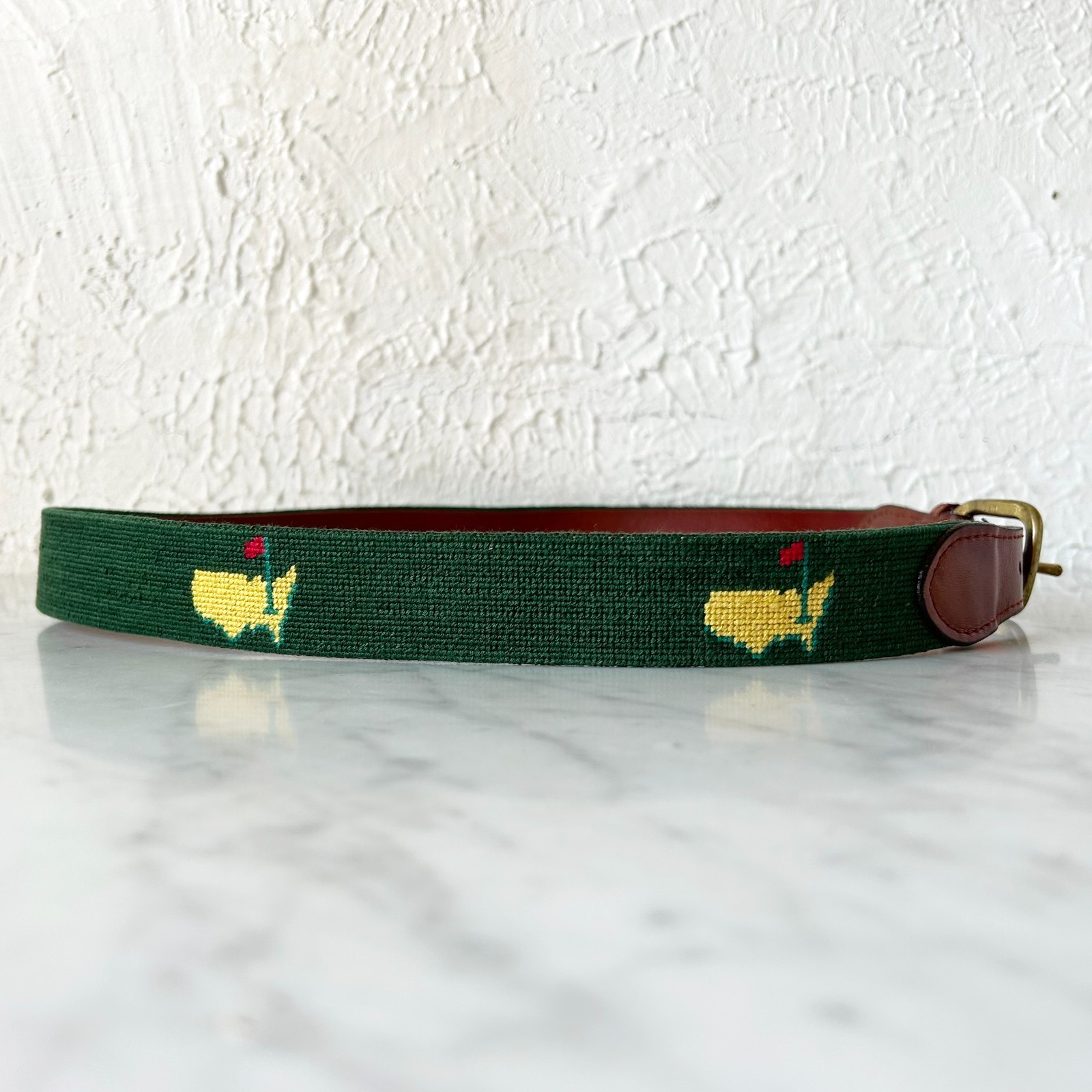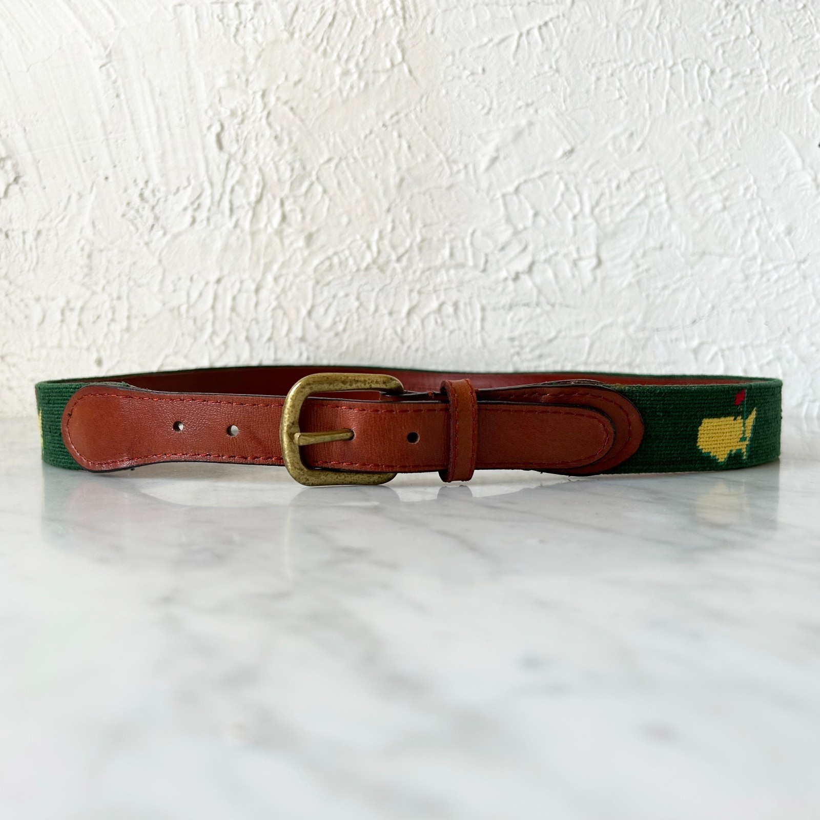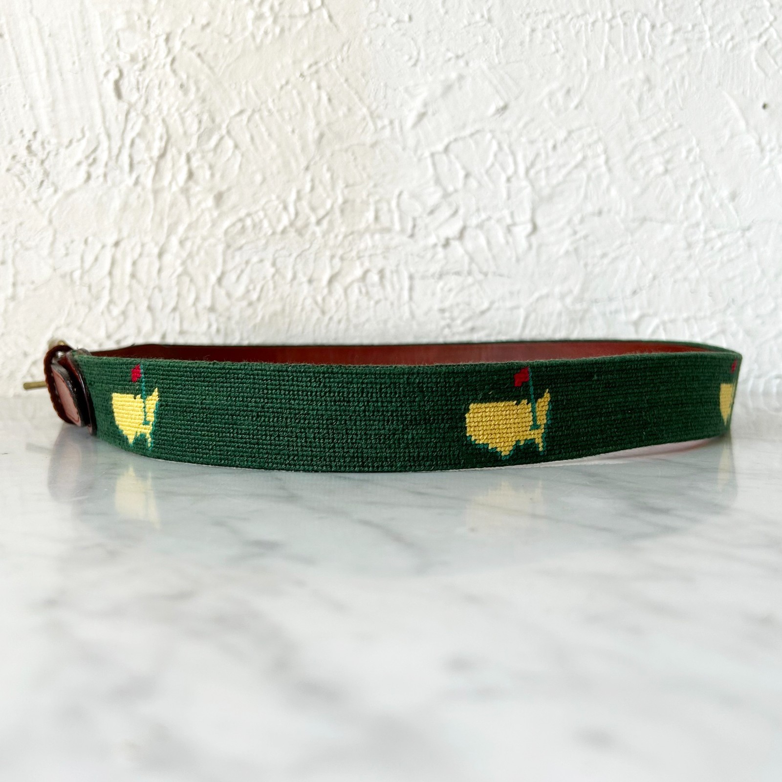 Masters Augusta Golf needlepoint belt by Smathers Branson. Hand-stitched green needlepoint with yellow and red logo combines with brown leather and solid brass buckle for a classic combination. Belt is adjustable; men's size 38. Excellent condition.