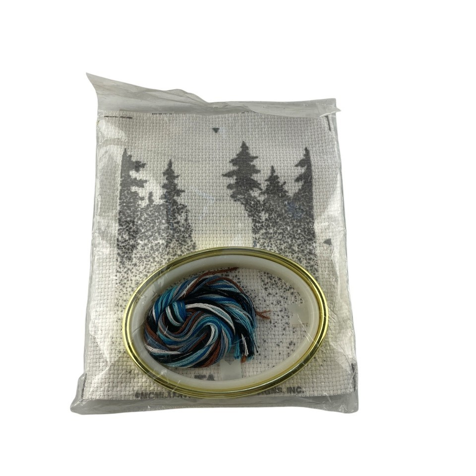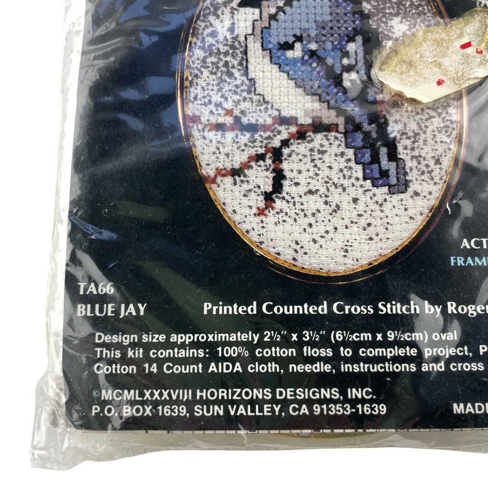 BLUE JAY features a bird perched on a branch in forest of gray trees. Kit includes gold color oval frame, printed Aida cloth, instructions and needle.