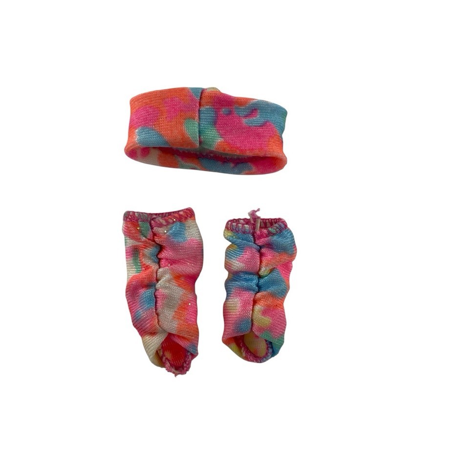 The Barbie Scrunched Seam Leg Warmers and Headband doll accessories in pink and blue watercolor design are part of the Barbie product line by Mattel. Designed for girl dolls, this set includes a headband and leg warmers, perfect for adding a trendy touch to your Barbie's outfit. With a time period manufactured between 1990-1999, these accessories are a charming addition to any Barbie enthusiast's collectionly.