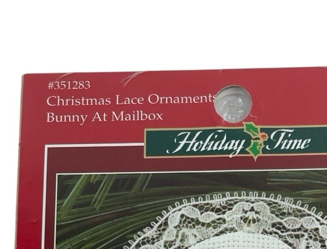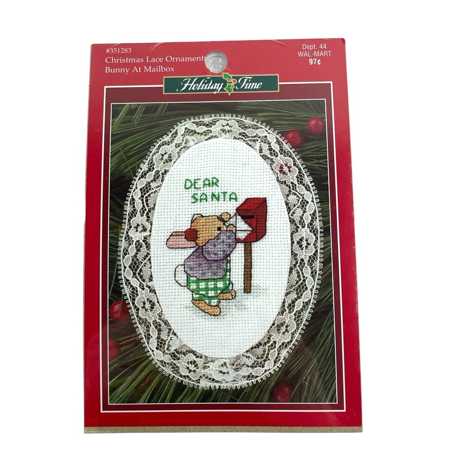 The Leisure Arts Cross Stitch Ornament Kit BUNNY AT MAILBOX, from Holiday Time, is a framed picture ornament craft project featuring a holiday-themed design of a bunny reaching up to put a letter to Santa in a mailbox with the words Dear Santa above. Made in the United States, this cross stitch kit includes lace border for added elegance.