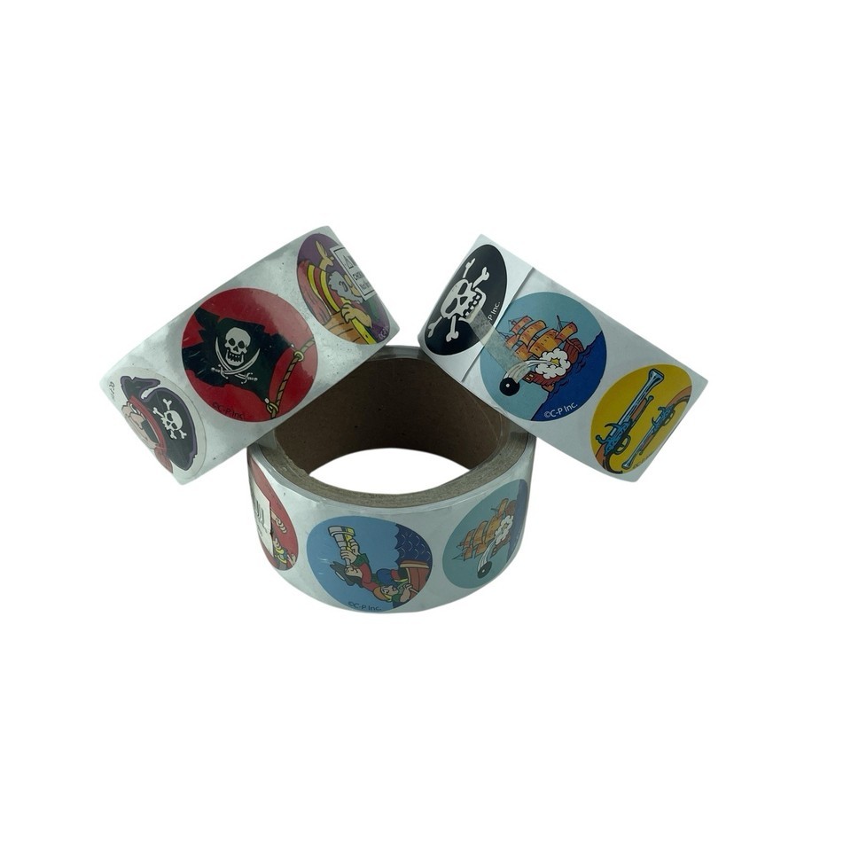 The U.S. Toy Pirate Stickers are 3 rolls of 100 stickers each, for a total of 300 stickers. These stickers are perfect for parties or stocking stuffers, featuring a pirate theme that kids will love. n and playful touch to any project.