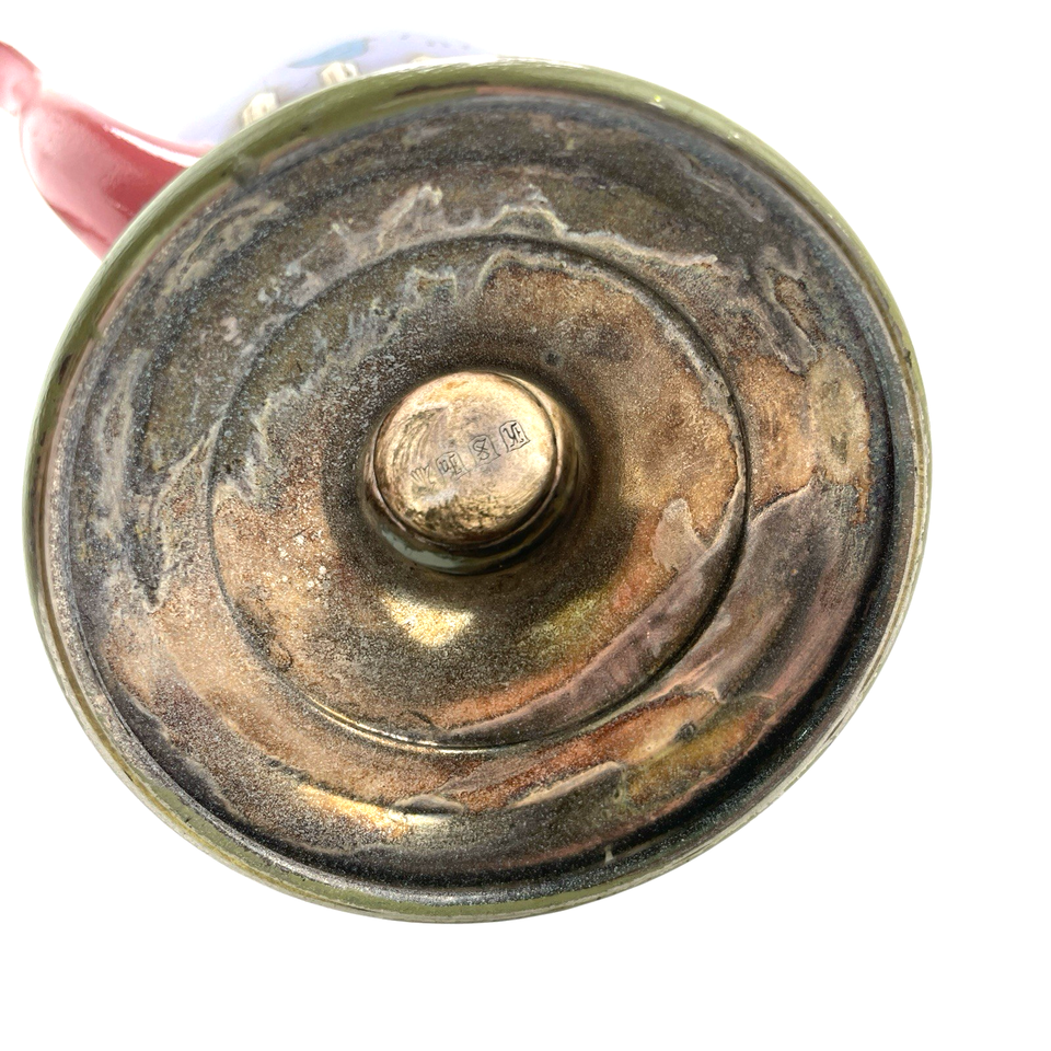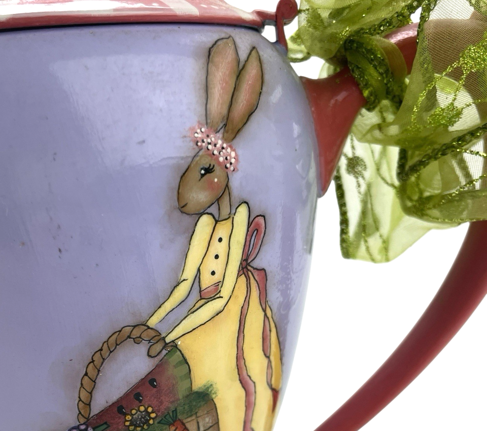 This whimsical hand-painted metal tea pot features a charming anthropomorphic tall bunny rabbite in a cottage core dress holding a basket of carrots and listening to a blue bird on a white picket fence sing. On the other side of the pitcher is a carrot tree. The body of the pitcher is in a warm lavender color with the spout, handle and top in pink and the base in green. It is accented with a sparkly green wire ribbon. Just a lovely decor piece.