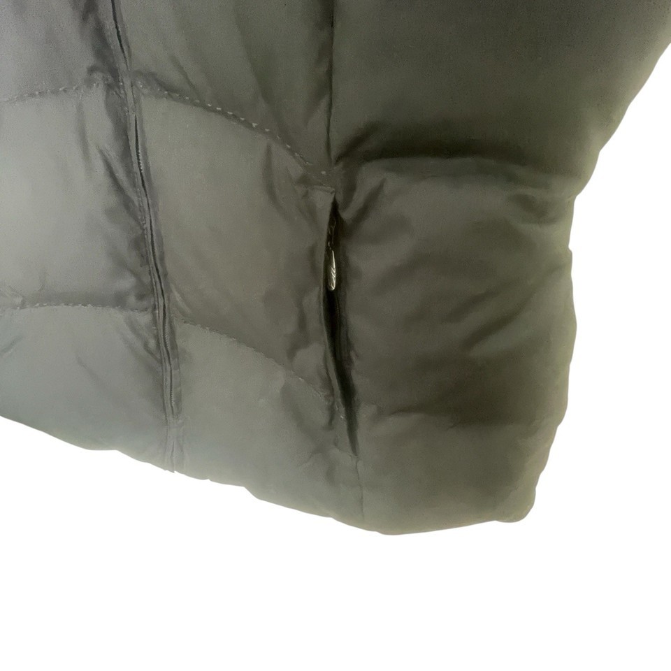 This Eddie Bauer Women's Black Puffer Vest in size M is a garment featuring premium goose down insulation, making it both warm and stylish. The quilted design adds a touch of outdoor flair, while the full zipper and logo accents give it a trendy look.
