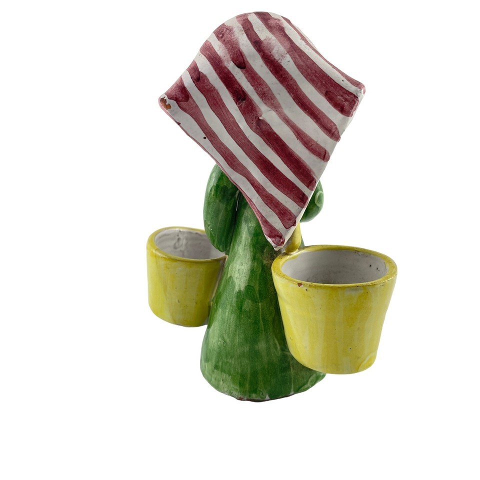This adorable girl has a spring green dress and striped head scarf.The mild buckets are lemon yellow.