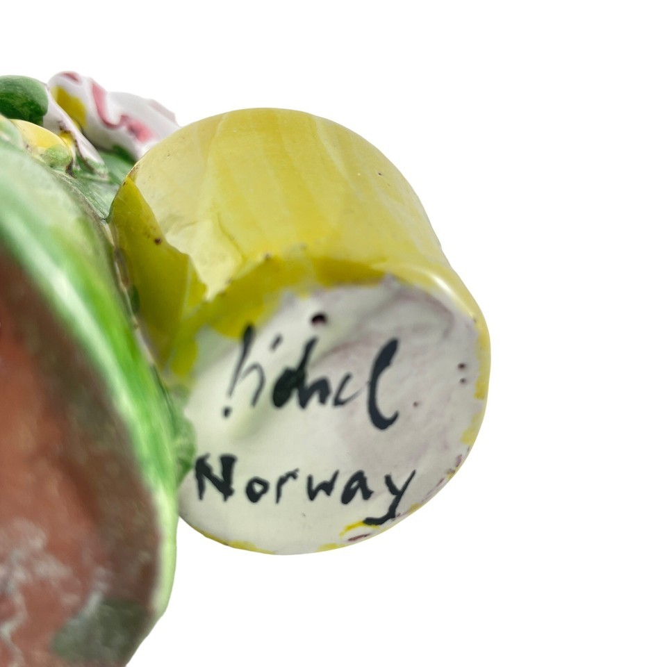 This beautiful figurine from a Norweigan artist depicts a milkmaid girl in traditional Norwegian farm attire. Sculpted of clay and hand painted, the glossy finish make it a perfect addition to any collection of decorative figurines.