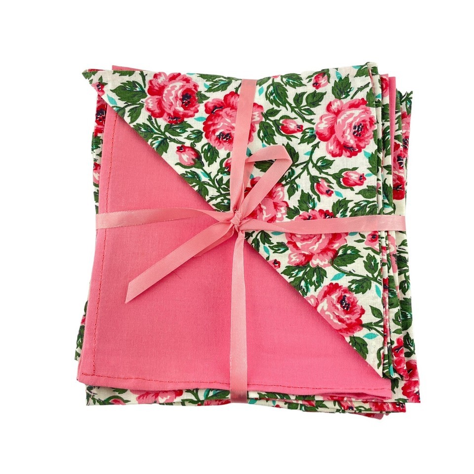 Vintage Handmade Tea Napkins Pink Rose Floral Cottage Core 80s Set of 6