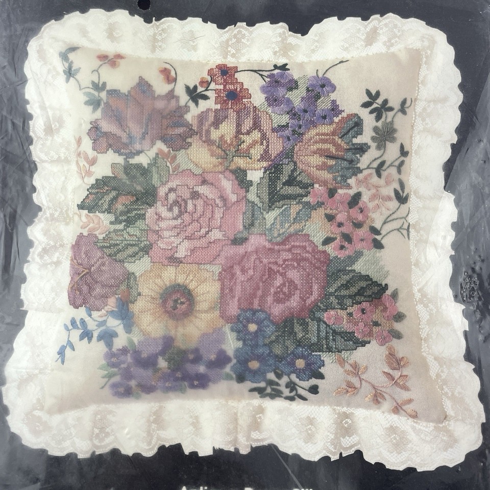 The Golden Bee Stamped Cross Stitch Kit Antique Roses Pillow is a charming 14x14 inch hand embroidery kit featuring a design of antique roses. Made in the United States, this kit includes everything needed to create a beautiful cross stitch pillow with a floral theme. Very cottagecore!