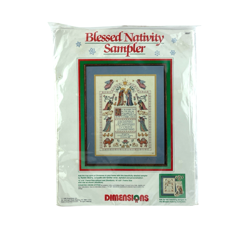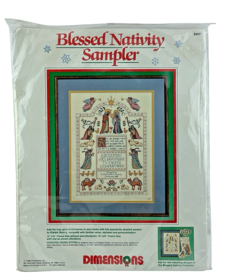 The Dimension Counted Cross Stitch Sampler Christmas BLESSED NATIVITY 8357 is a hand embroidery kit featuring a framed picture of a Nativity-themed sampler. This 12x16 inch sampler from the United States, specifically designed by the brand Dimension, is perfect for cross stitch enthusiasts looking to create a festive and intricate piece of art for the Christmas season.
