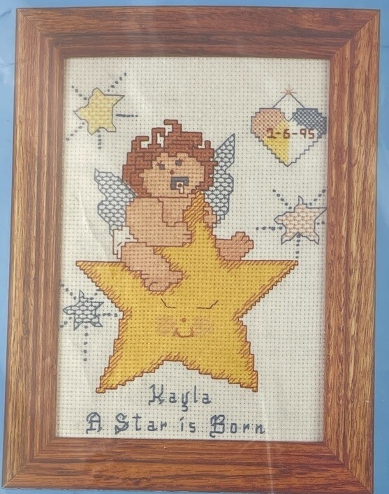 This is a Candamar Designs Cross Stitch Kit featuring the "A Star Is Born" design, perfect for a baby announcement. The kit includes materials to create a framed picture measuring 5x7 inches. The style of this cross stitch kit is framed, making it easy to display once completed. Perfect for crafters interested in embroidery and cross stitch projects with a baby theme.