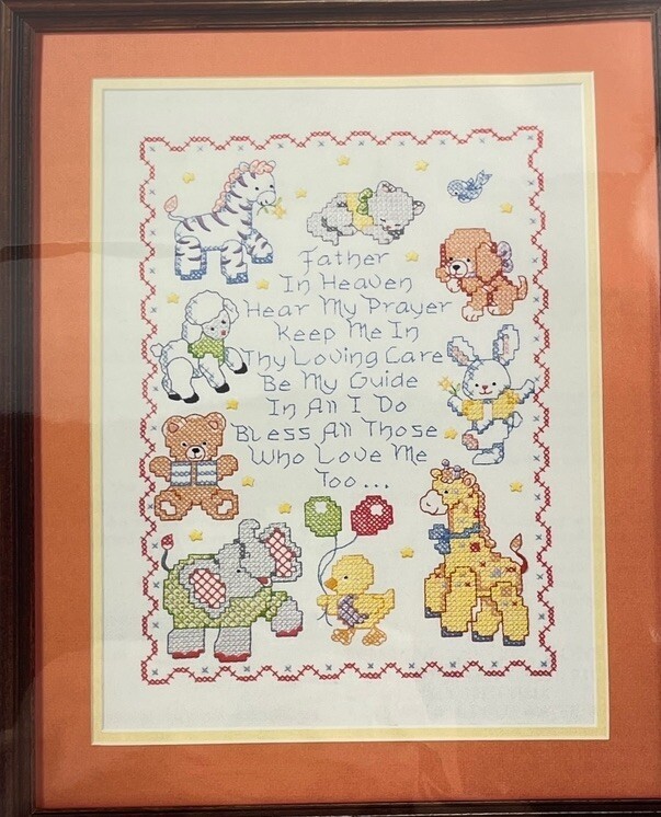 Bucilla Stamped Cross Stitch Nursery Prayer Baby Animals Partial Started 40859