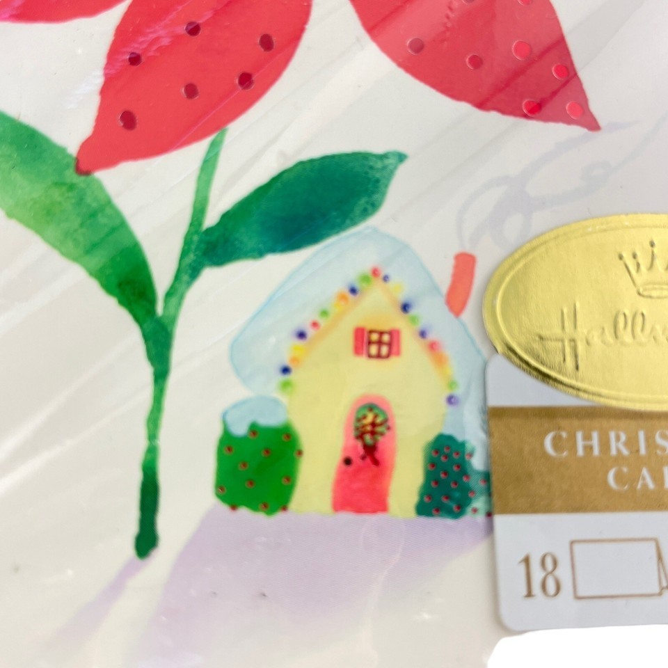 Celebrate the holiday season with these beautiful Hallmark Christmas cards adorned with red poinsettia and a tiny home design. Each card comes with an envelope for easy mailing. The whimsical floral pattern adds a touch of modernity to the vintage design. Perfect for sending to friends and family during the Christmas season.