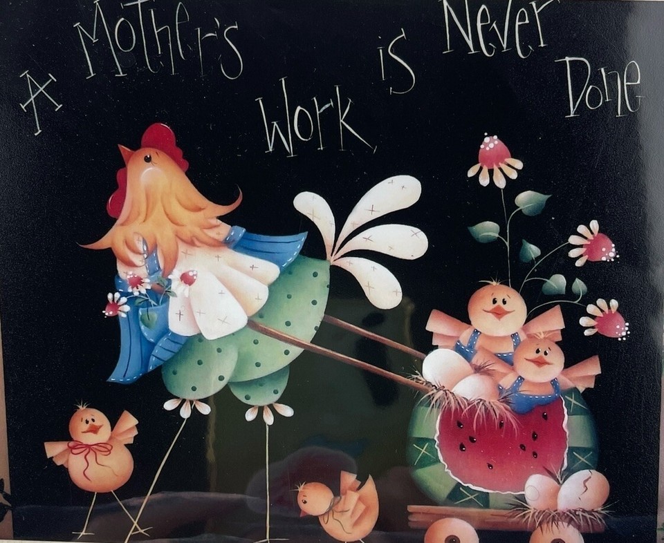 Woodworking craft pattern and instructions featuring a long legged mother hen pulling a watermelon wagon filled with her chicks. Other chicks cavort around her legs.