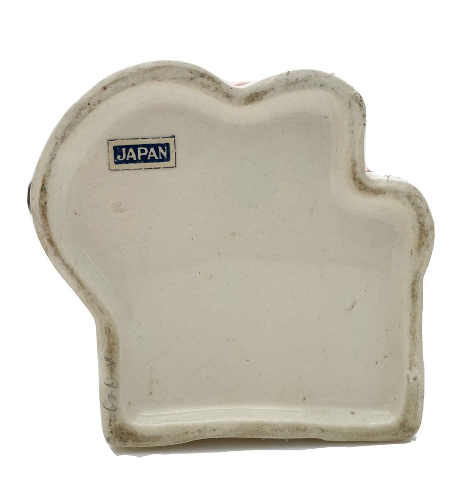 This vintage Japanese pincushion is a charming addition to any collection. Crafted from ceramic with the shape of an adorable puppy dog, it comes with three decorative pins to adorn it. The pincushion is a great example of craftsmanship from Japan, and is sure to add a touch of whimsy to any sewing project.