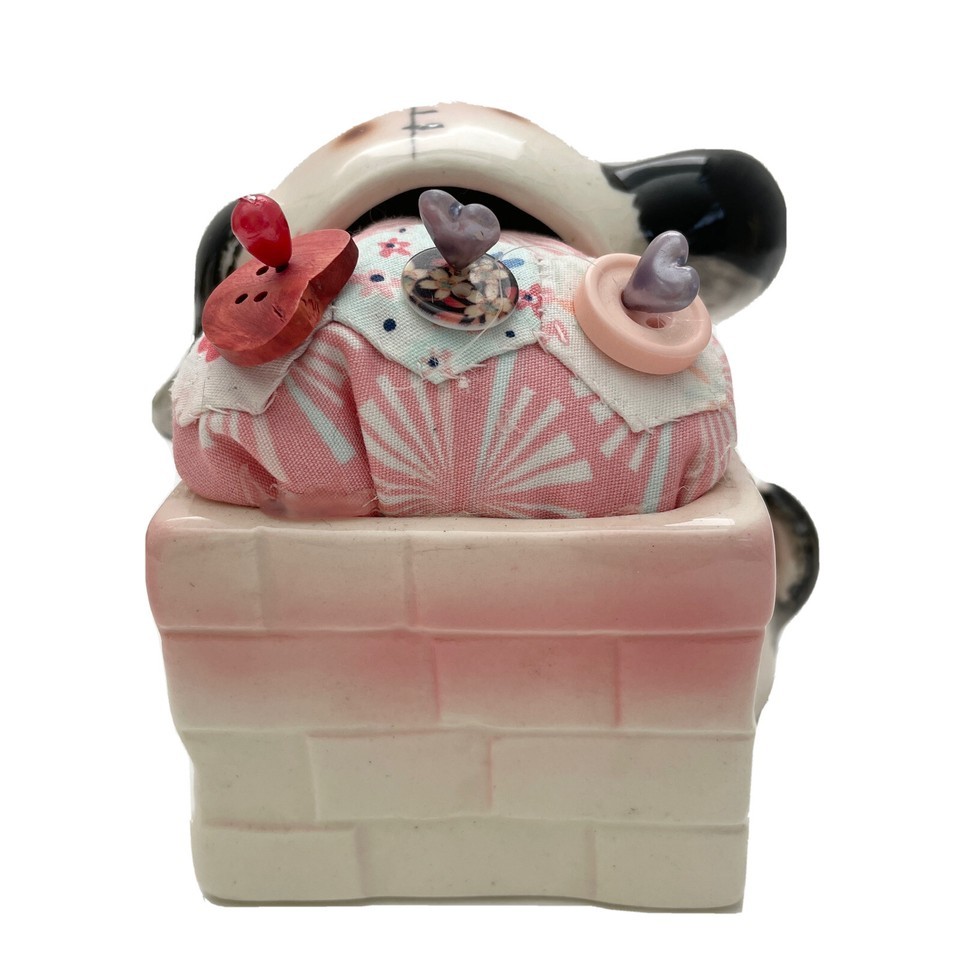 Vintage Japanese Pincushion Puppy Dog Ceramic + 3 Decorative Pins