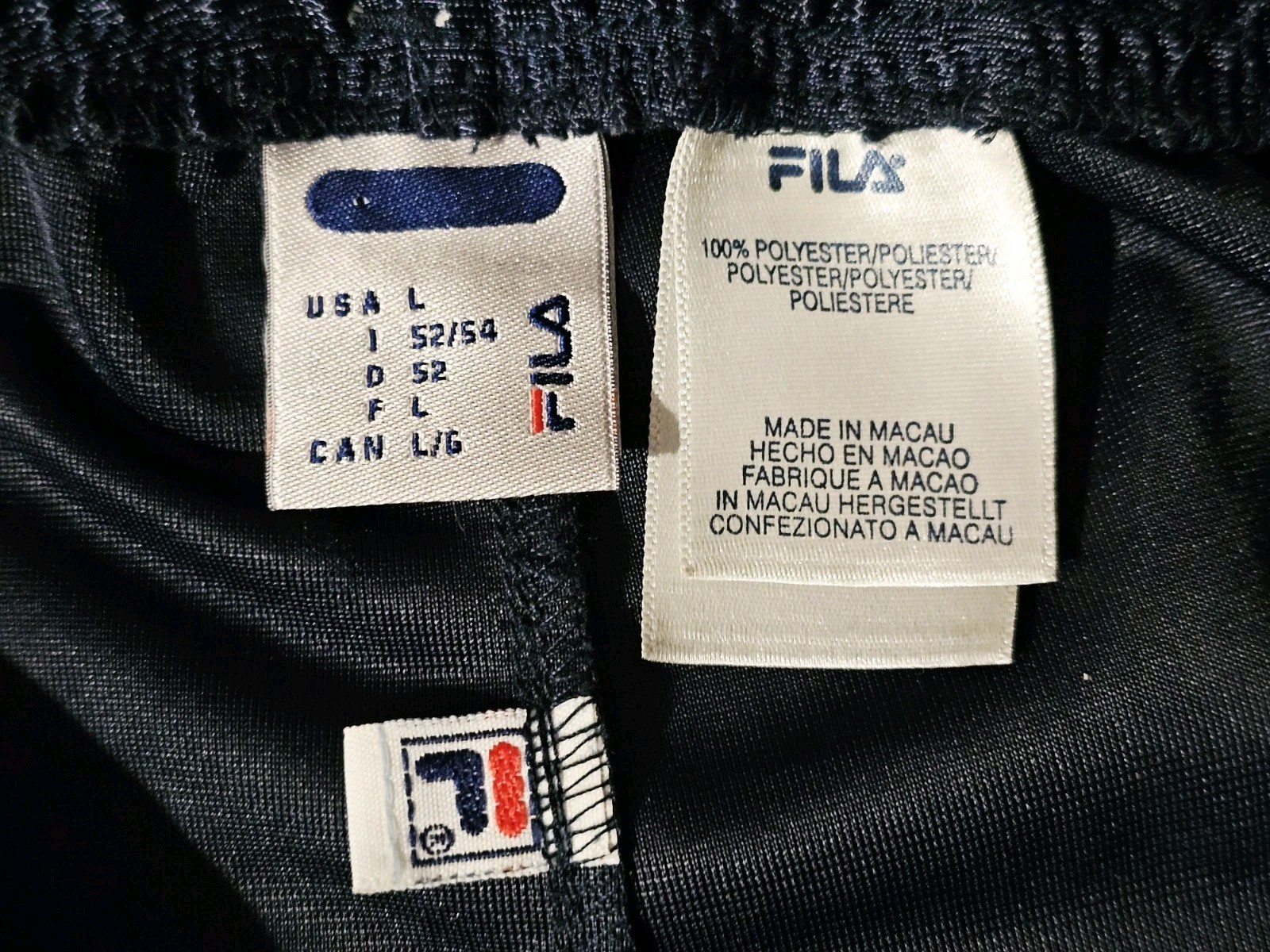 The product is a pair of 90's Vintage Fila Blue Breakaway Snap Side Track Pants for men in size Large. Made of polyester, these pants feature a sportswear/beach look with a blue, red, and white color scheme. They are original and were manufactured in Macau during the 1990s. The snap side design adds a unique touch to this retro track pants, making them a stylish addition to any vintage clothing collection.