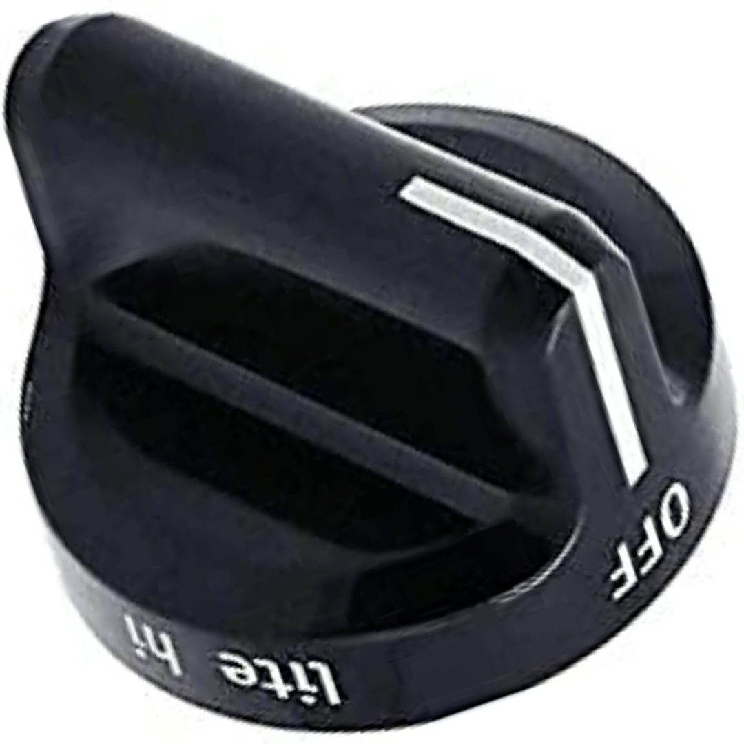 Range Top Burner Control Knob. Black color. This is a new replacement part.