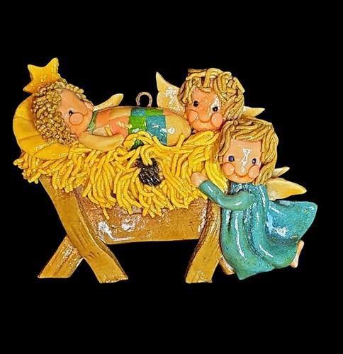 Vintage 1978 Handcrafted Salt Dough Christmas Ornament Baby Jesus Angels Manger