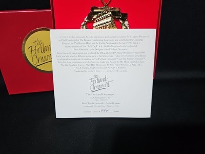 This collectible Christmas ornament from the Portland Ornament series features the iconic Governor Hotel in stunning detail. Designed by Betty Gimarelli, this 1997 edition was part of a limited production run of only 15,000 pieces.