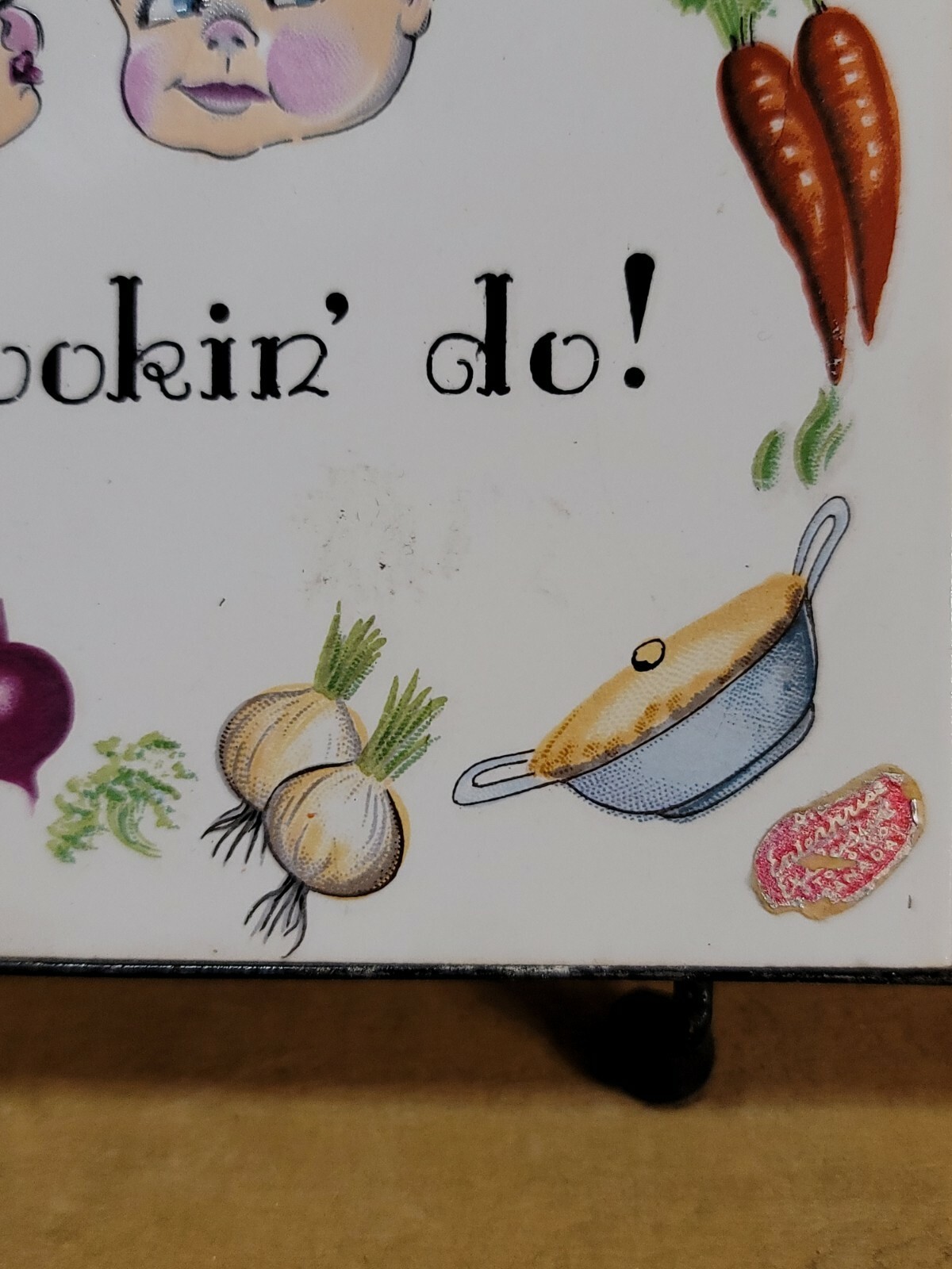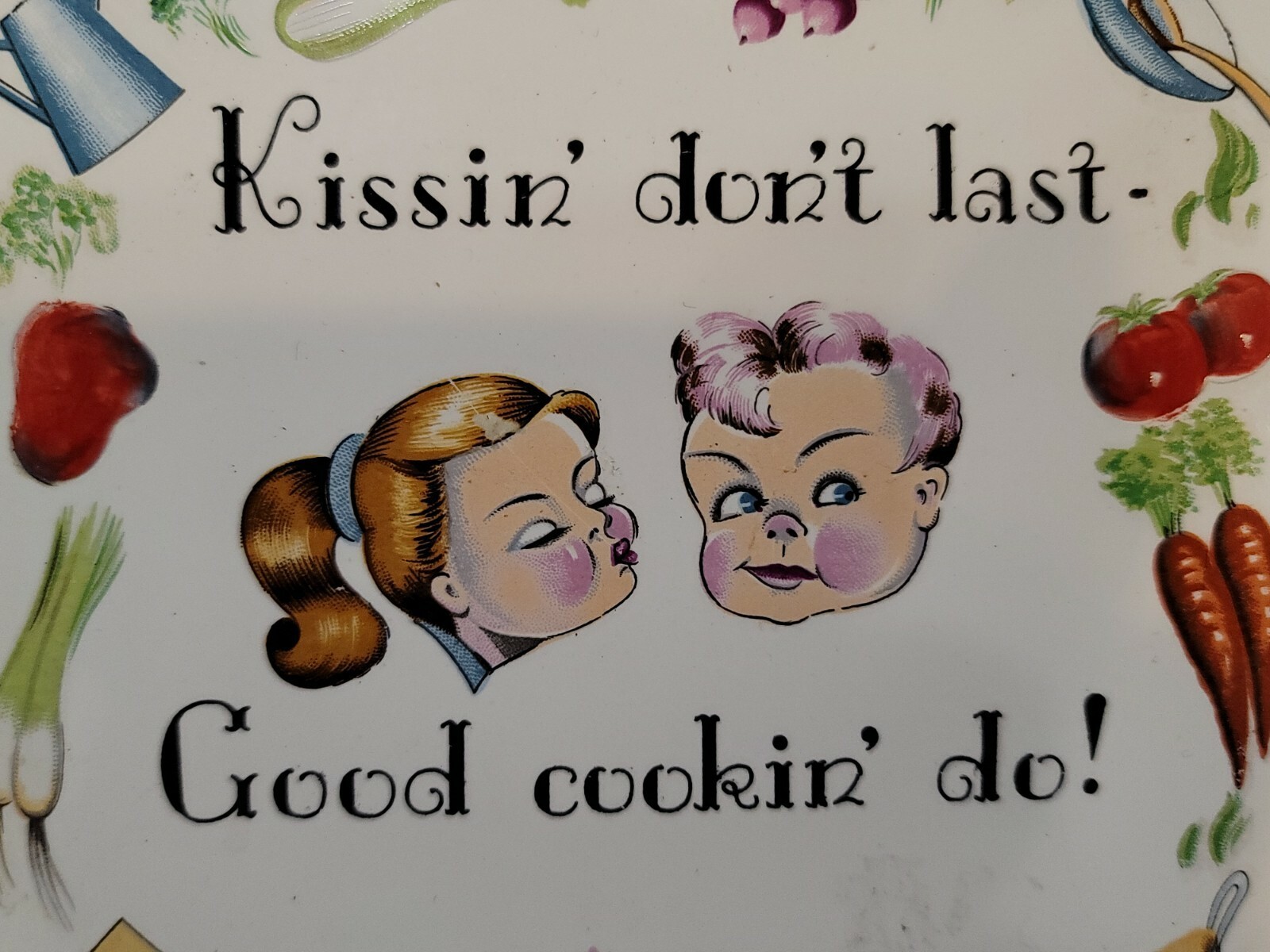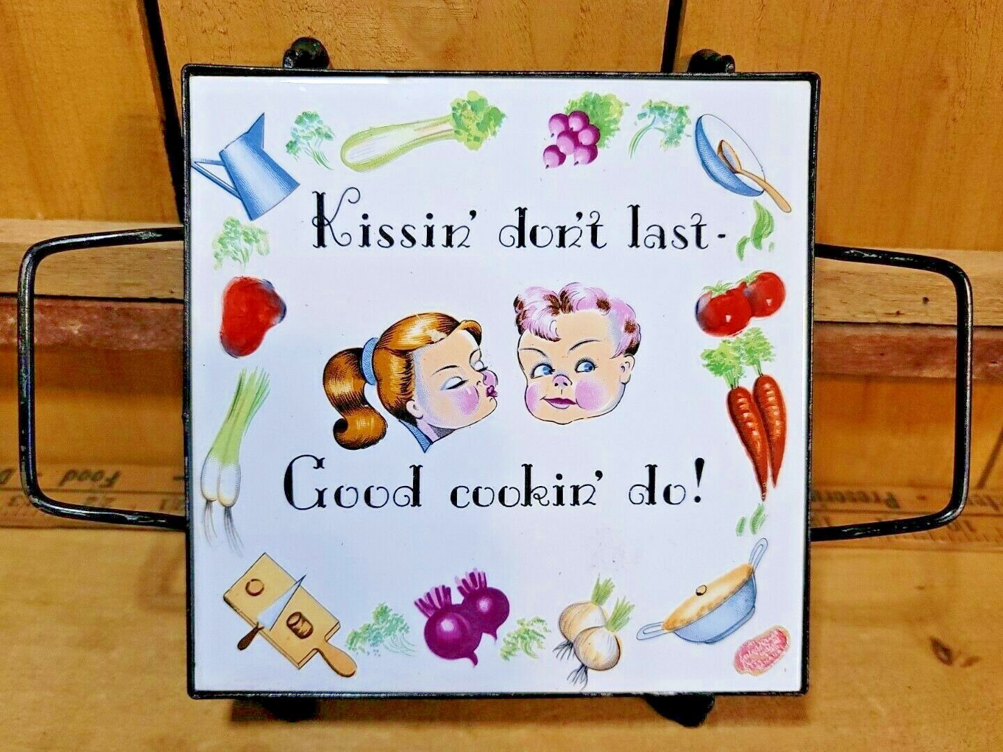 Lefton Metal Ceramic Trivet-Kissin' don't last Good cookin' do! Vintage MCM 50s